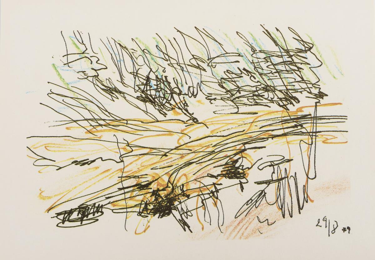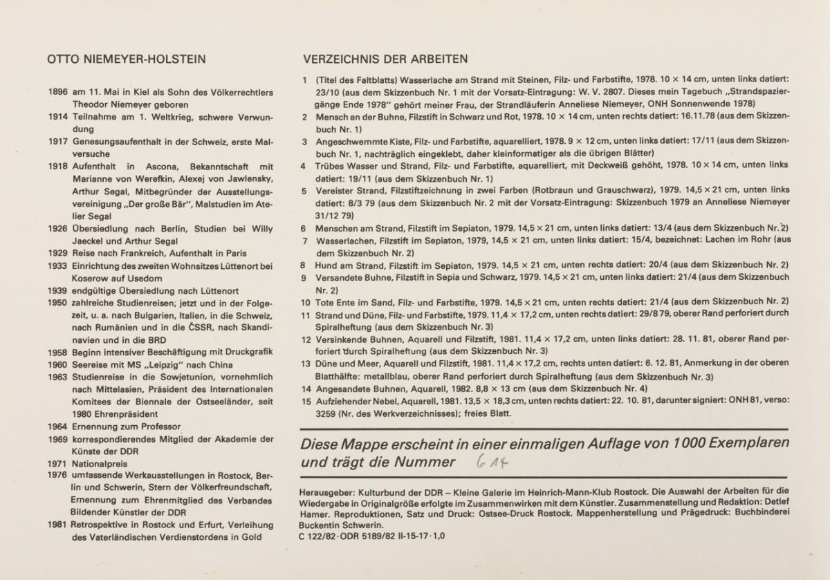 Complete portfolio with 14 loose color lithographs and title fold-out with color lithograph, preface, biography and table of contents, published by the Kulturbund der DDR, in original embossed folder; folder cover with dedication in ink "for Ralf Storandt, who does not go to the beach - from work zeal ONH August 1983".