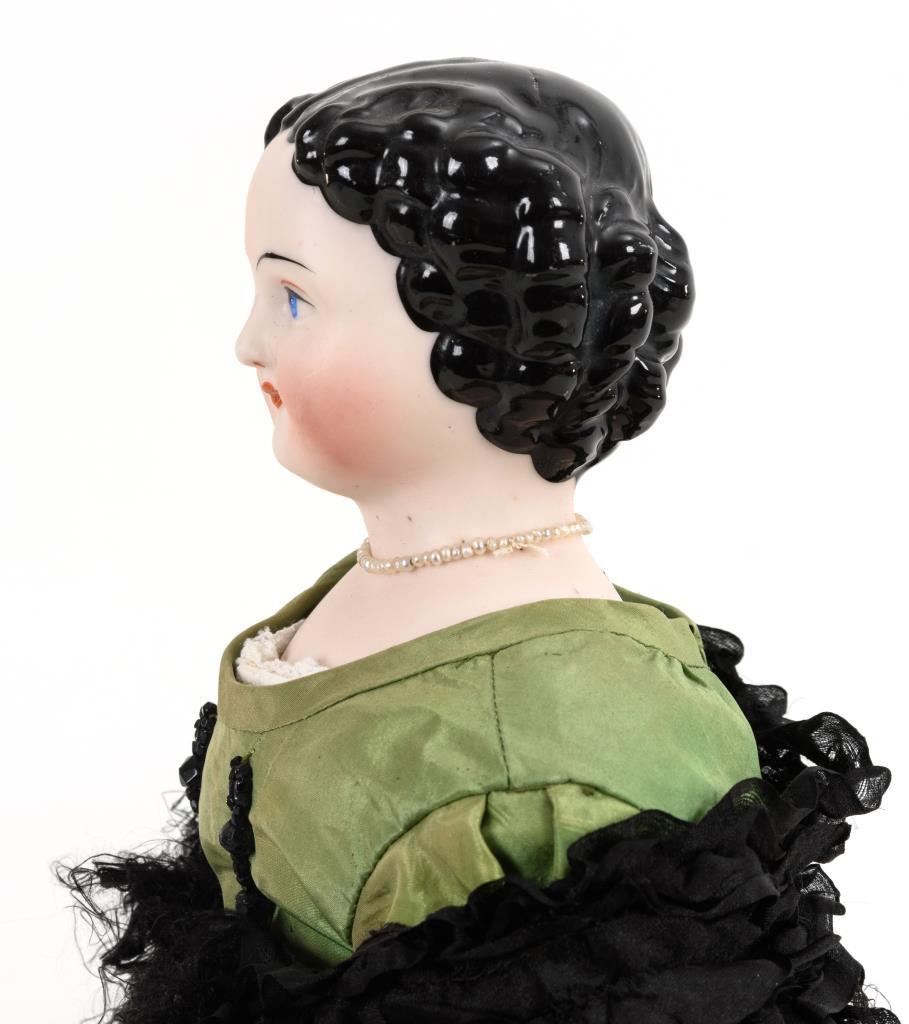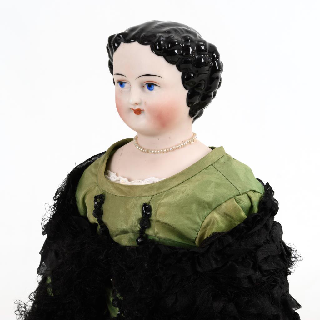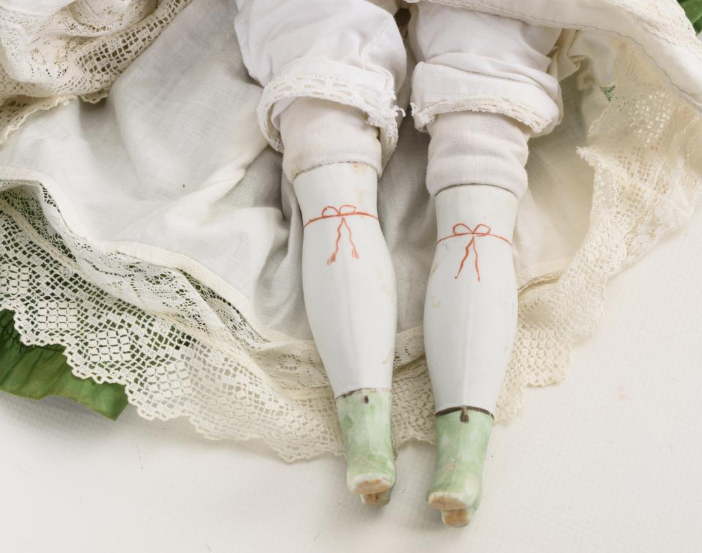 Biskuitkopf mit glasierten Haaren, gemalten blauen Augen, geschlossenem Mund. Stoffkörper mit Biskuitgliedern und anmodellierten Stiefeln. Grünes Kleid mit schwarzem Spitzenbesatz, zerschlissene, schwarze Stola. Körper neu, 1 Brandriss in den Haaren.