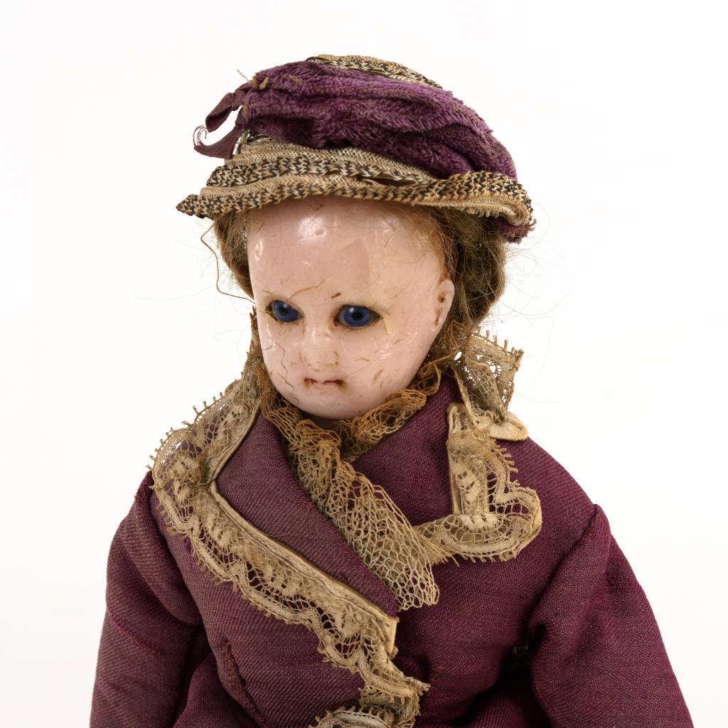 Frühe Wachskopfpuppe mit blauen Schlafaugen, geschlossenem Mund und blonder Echthaarperücke mit Zöpfen. Leinenkörper mit Biskuitarmen. Purpurfarbenes Kostüm mit Spitzenbesatz, alte weiße Stoffschuhe. Kopf rissig, 1 Daumen fehlt, Altersspuren.