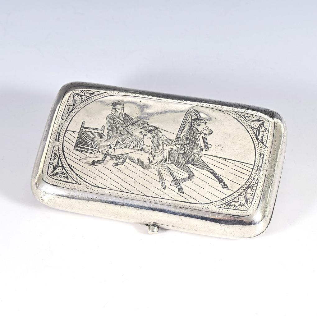 In niello technique decorated box with horse sleigh on the front and intertwined monogram engraving IM on the bottom. Signs of use, small dents.
