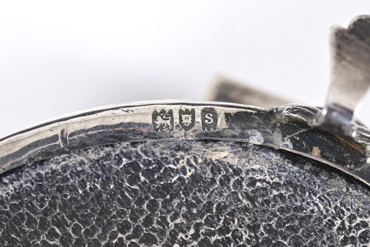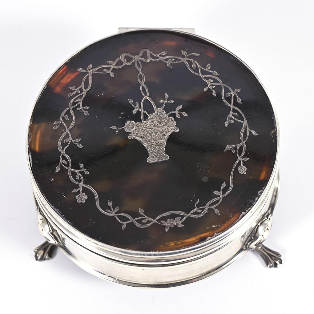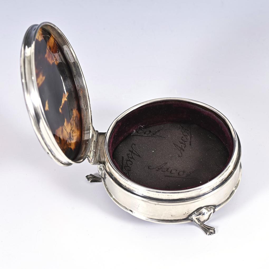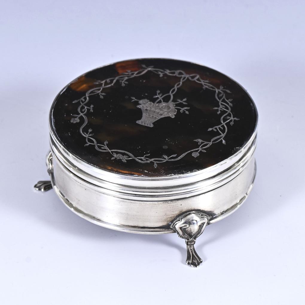 Round box, on 3 elegantly curved feet. Heavier signs of use, lid loose.