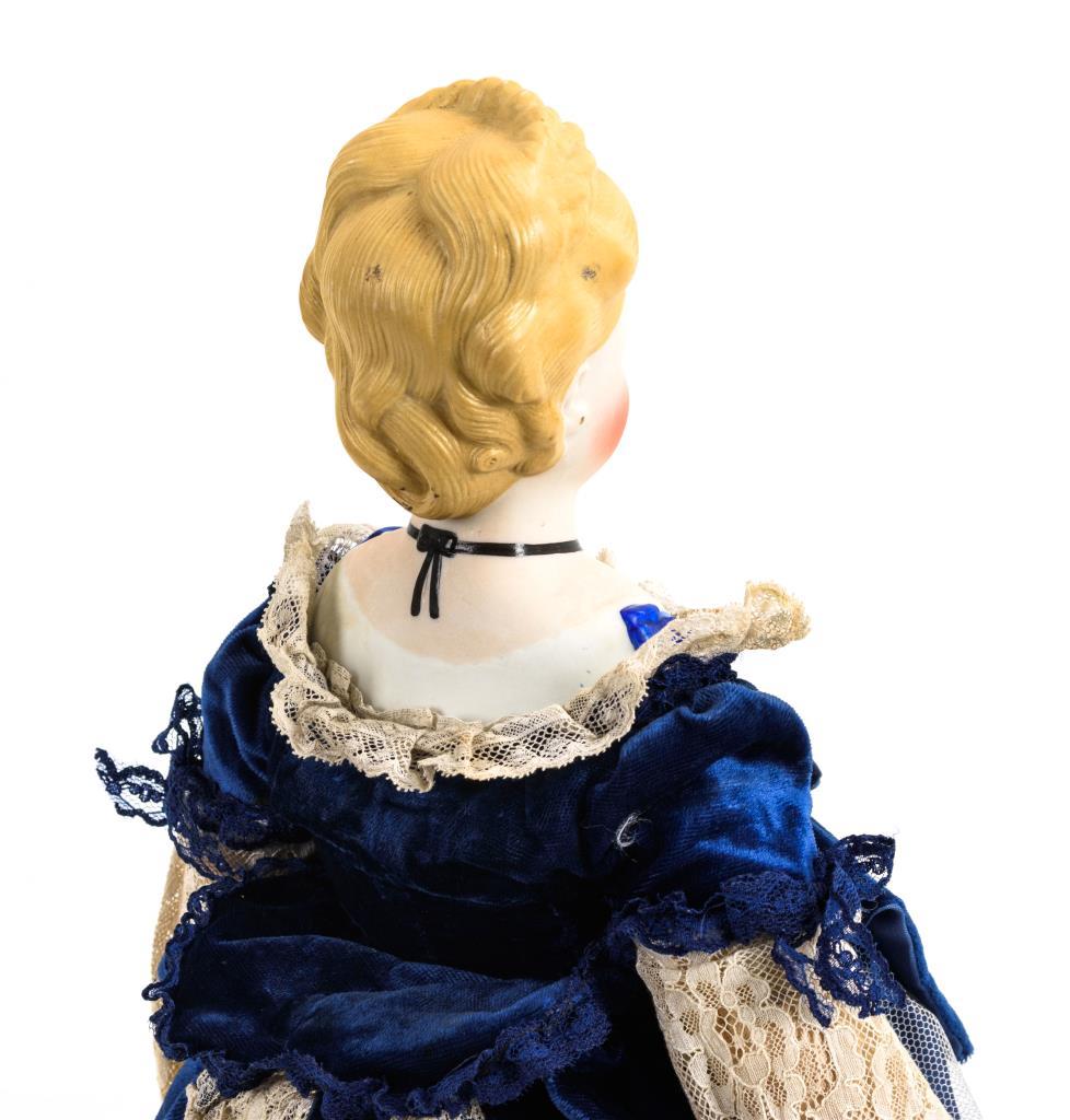 Große Puppe mit gemalten blauen Augen, geschlossenem Mund, Ohrlöchern und modellierter blonder Flechtfrisur. Brustplatte mit modellierter Bluse und Kette. Nachgenähter, weich gestopfter Stoffkörper. Langes blau-weißes Kleid mit Samt und Spitze. Minimale Altersspuren.
