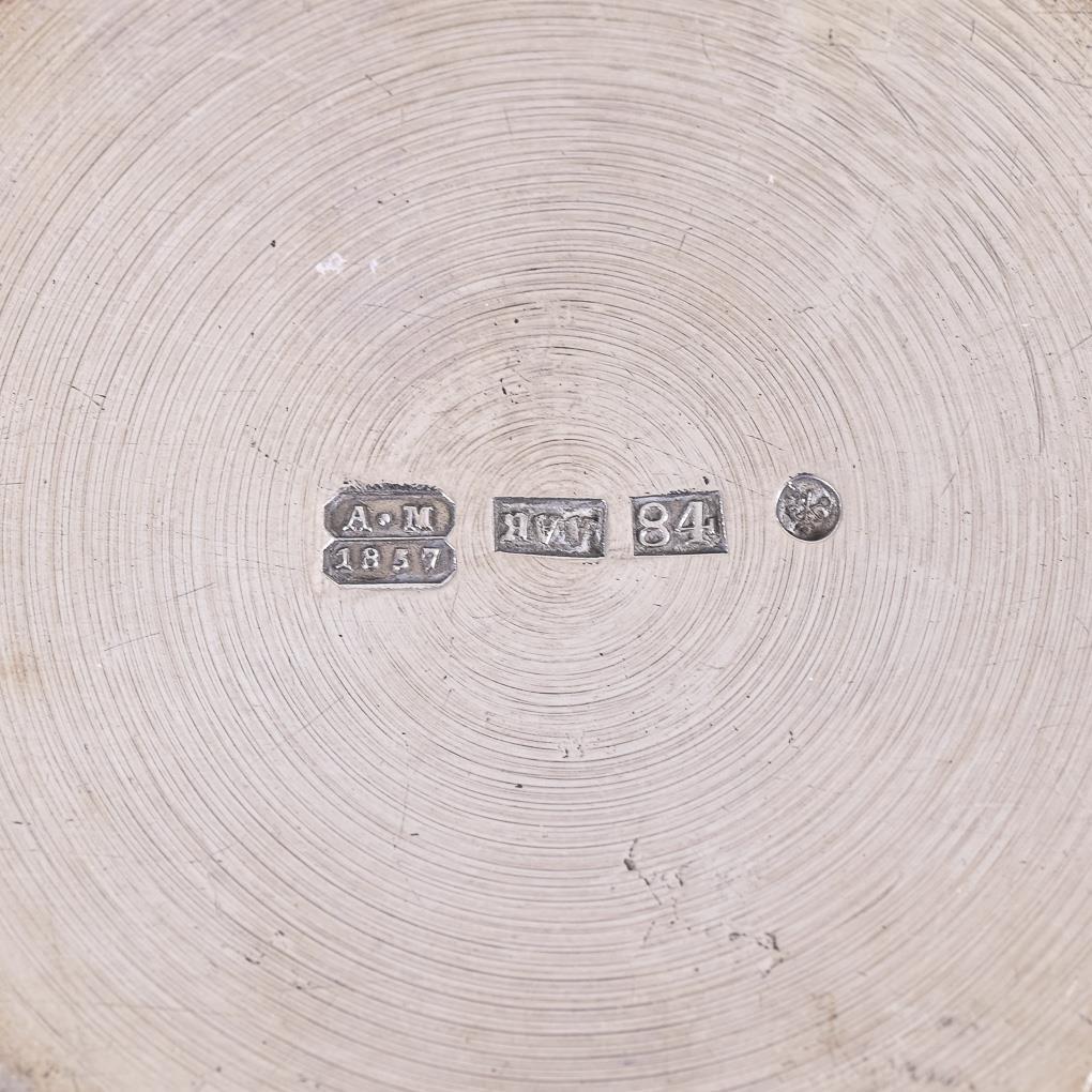 Cyrillic master mark/foamer/84 zolotniki/city mark hallmarked. 1857. st. petersburg.