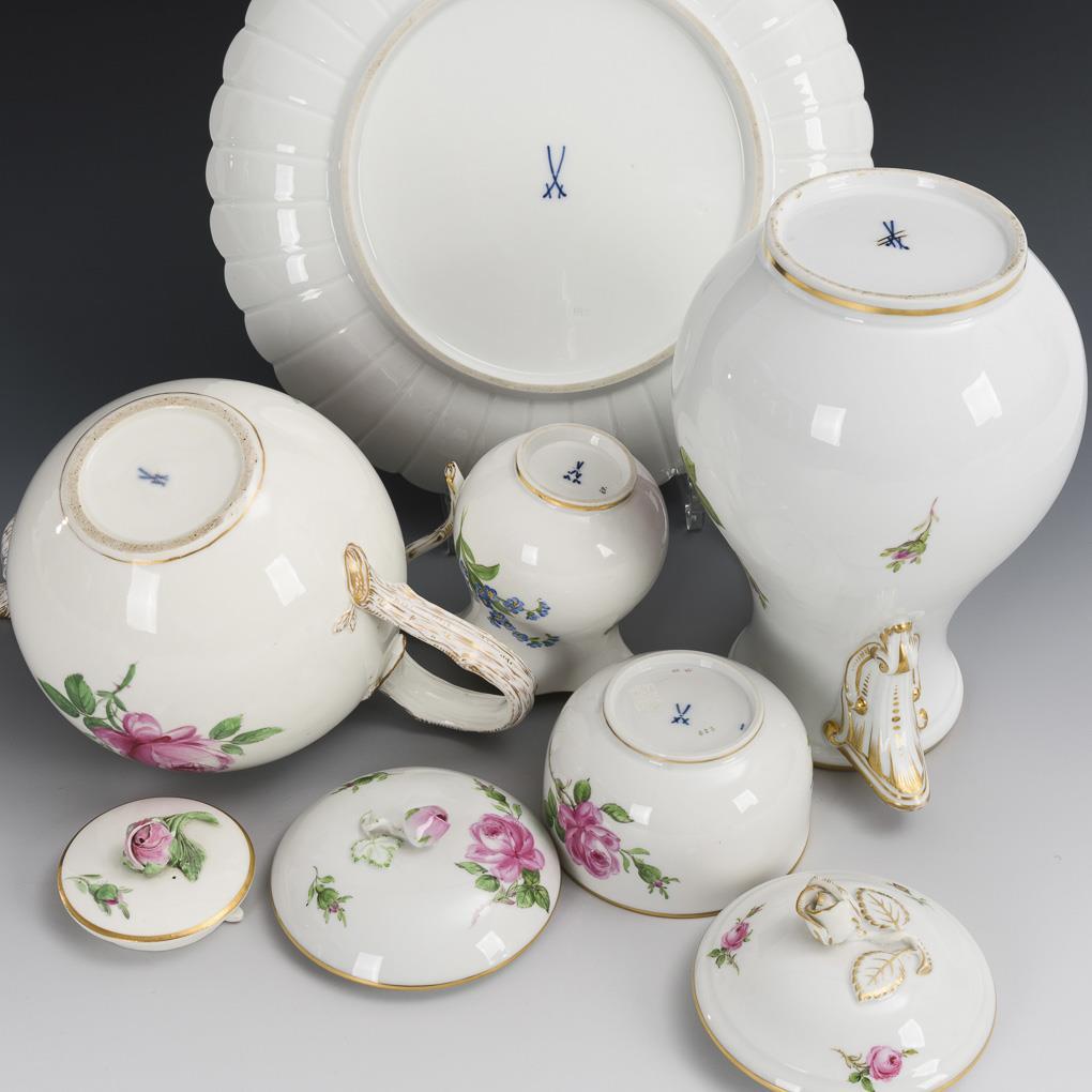 Form "New Cutout". Coffee pot (h 26 cm), teapot, cream jug, sugar bowl and fan plate (Ø 28 cm). 2 rose knobs minimally bumped, partially slightly gold rubbed.