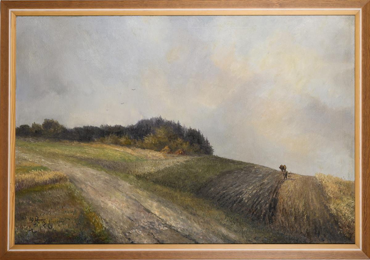 Farmer in the field with the plow under a gray sky.
