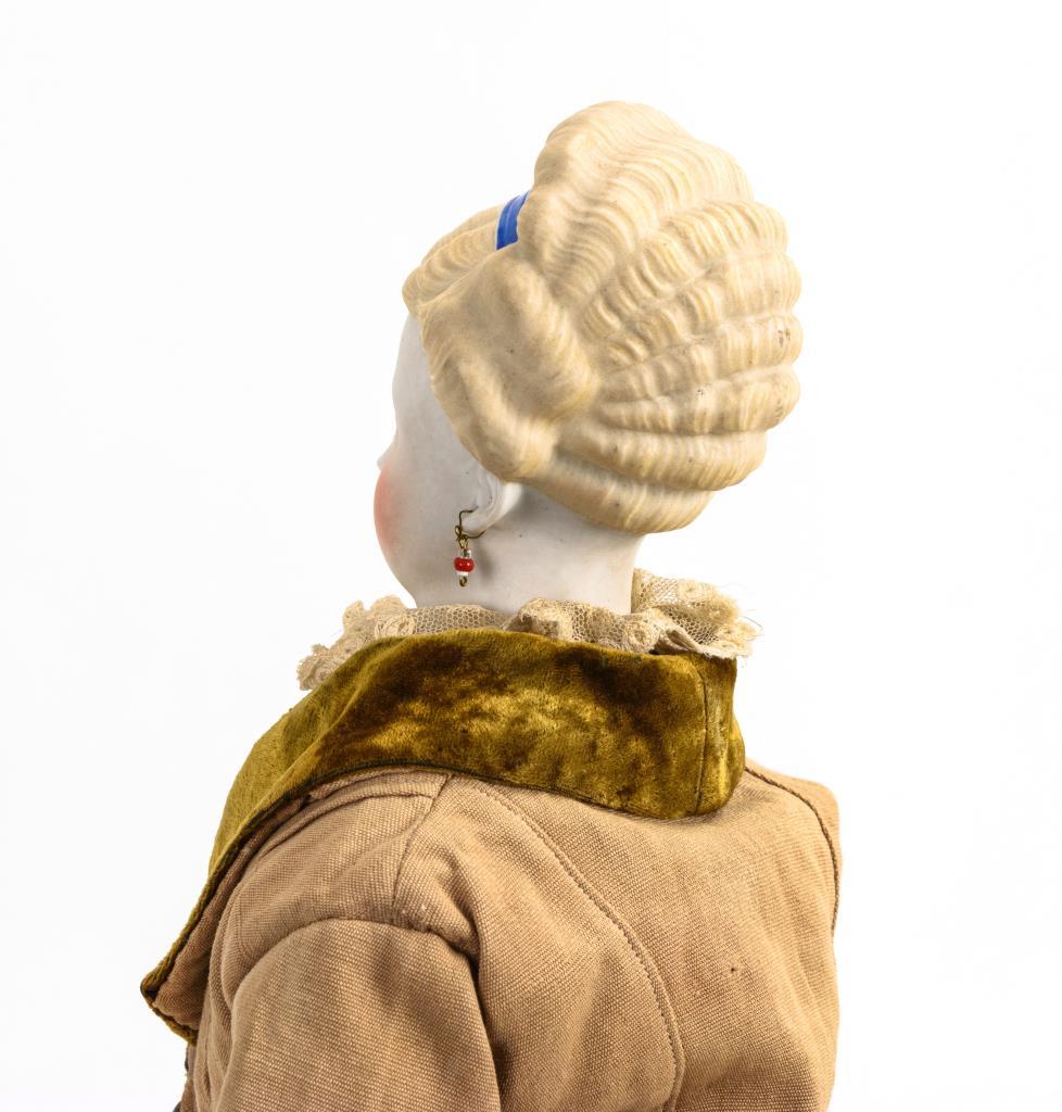Large doll with light chest head, painted blue eyes, closed mouth, earrings and blue hair band. Slim leather body. Beige costume with velvet collar. Body with signs of age. Clothing soiled, 1 shoe missing.