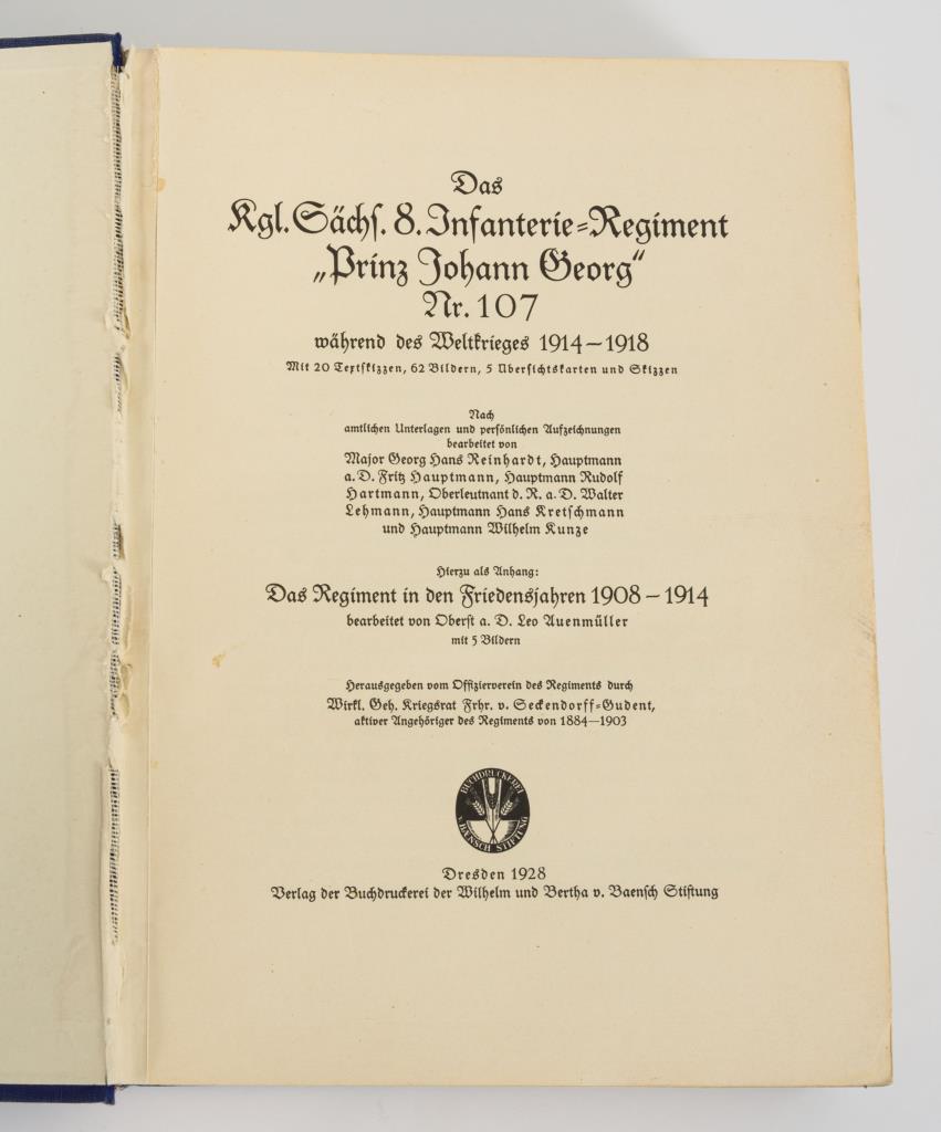 "Das Kgl. Sächs. 8. Infanterie-Regiment Prinz Johann Georg Nr. 107 während des Weltkrieges 1914-1918 und Anhang: Das Regiment in den Friedensjahren". Dresden 1928. 7, 519 Seiten und 3 Karten. Vorsatz fehlt, Stärkere Gebrauchsspuren. / "Geschichte des Königlich Sächsischen Leibgrenadier-Regiments Nr. 100", von Heinrich Herrmann. (1926). 11, 287 Seiten. Beide im blauen Leineneinband mit Altersspuren .