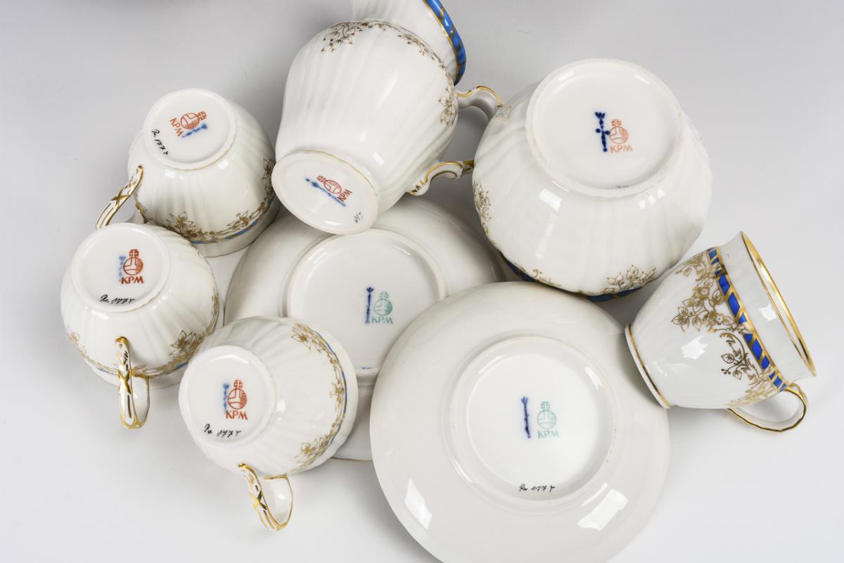 16 pieces. Model "Antikzierat". Mocha pot (h 21 cm), milk jug, sugar bowl, 6 mocha cups, 6 saucers and 1 confectionary bowl. Minimal bumping on the flower knob of the pot lid.