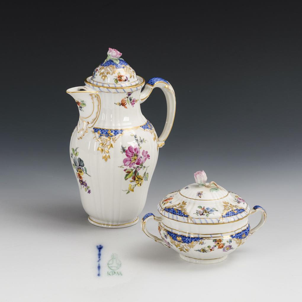 Polychrome floral painting, blue scale reserves and gold staffage. Mocha pot (h 21 cm) and sugar bowl (h 10 cm).
