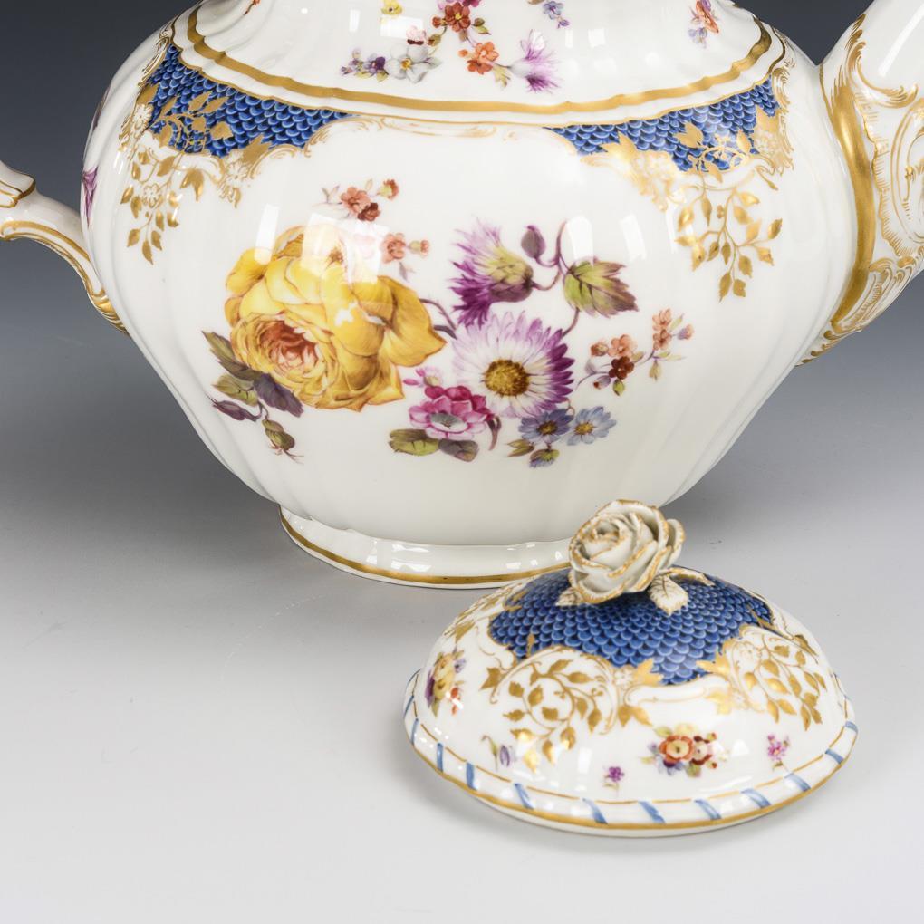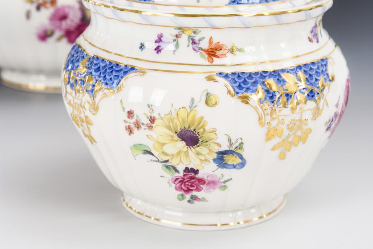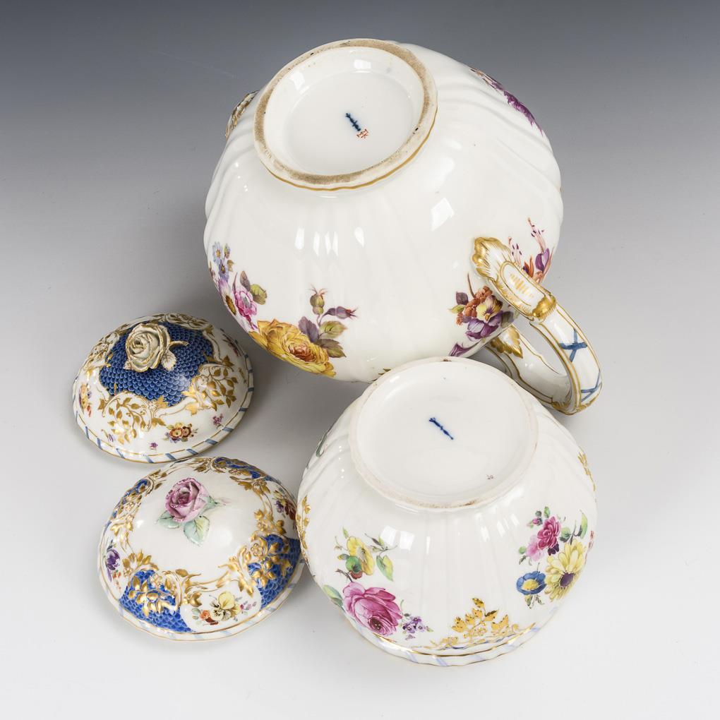 Polychrome floral painting, blue scale reserves and gold staffage. Teapot (h 18 cm) and sugar bowl (h 14 cm).