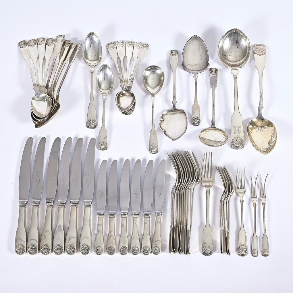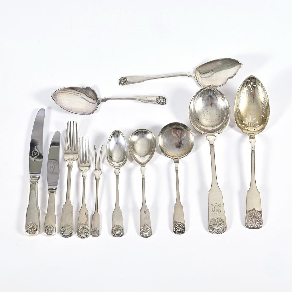 Spade shape with slightly different shell decorations: 12 menu forks, 6 menu knives, 12 menu spoons, 6 dessert forks, 6 dessert knives and 6 small soup spoons. In addition, 8 serving pieces (including 1 spoon with monogram engraving "IHD"). Slight signs of use.