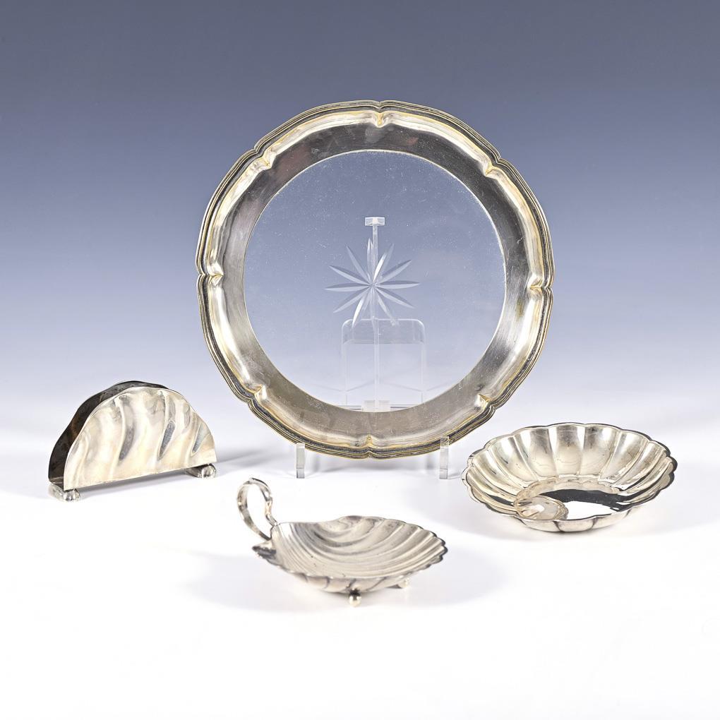 Round tray with cut bottom star and silvered rim./ Small round bowl./ Shell bowl./ Godroned napkin holder. Signs of use, silvering rubbed.