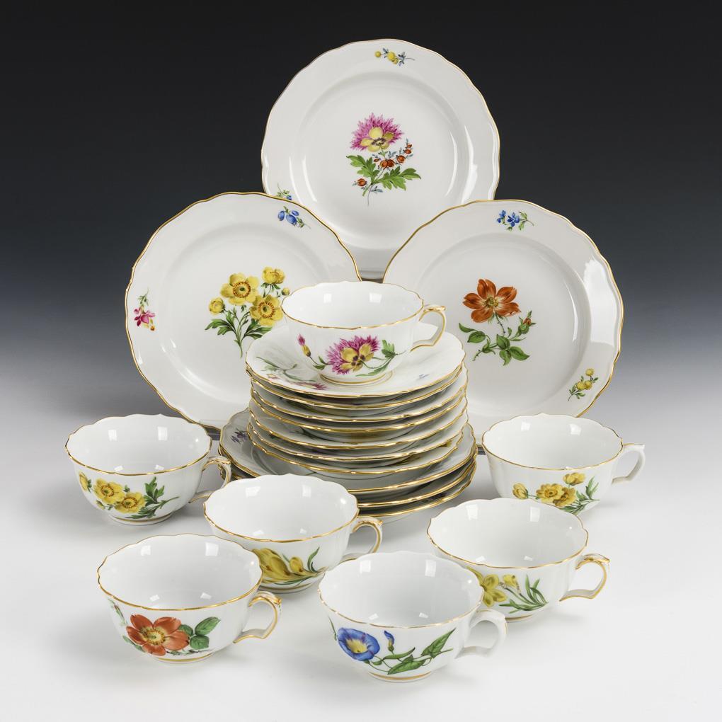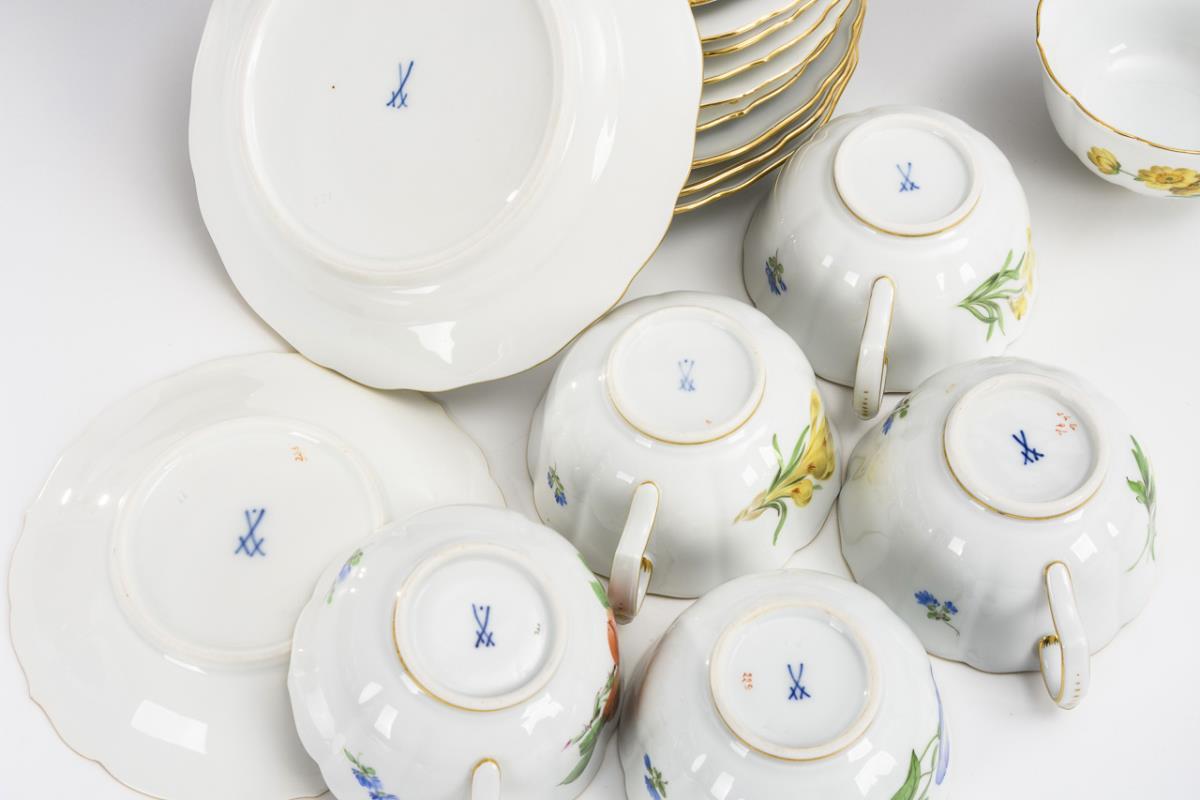 6 tea sets and 1 cup and saucer with floral painting. Meissen.