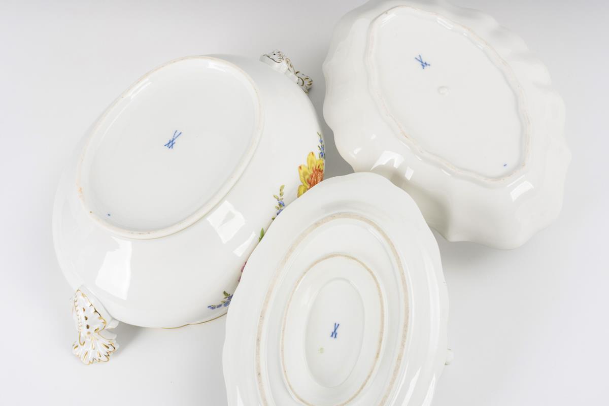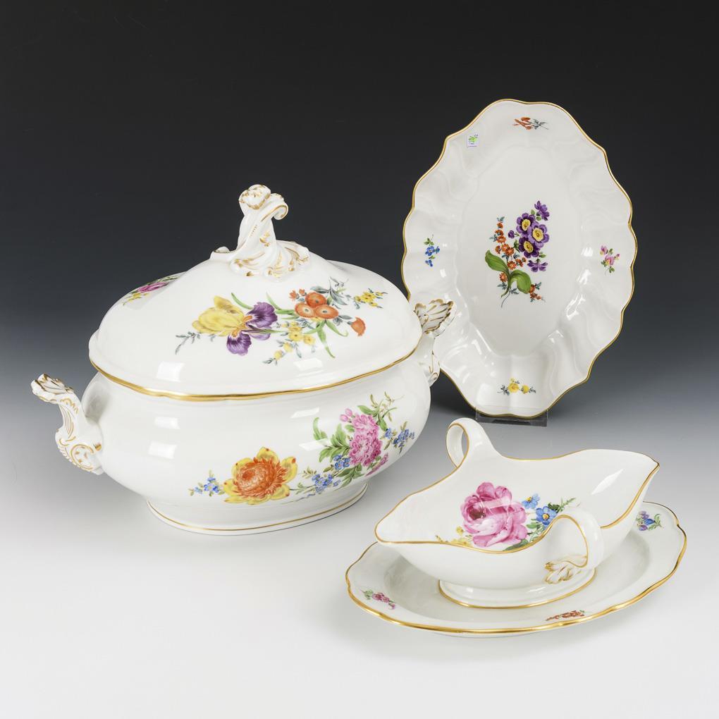 Terrine, sauce boat and oval bowl with floral painting. Meissen.