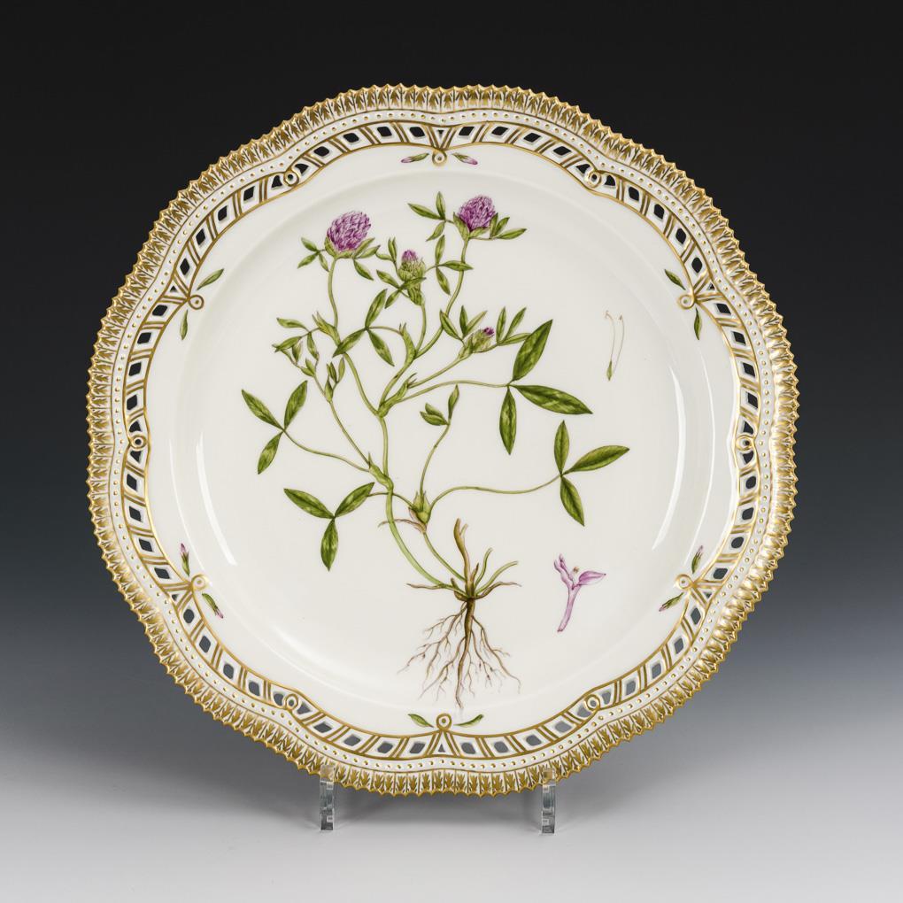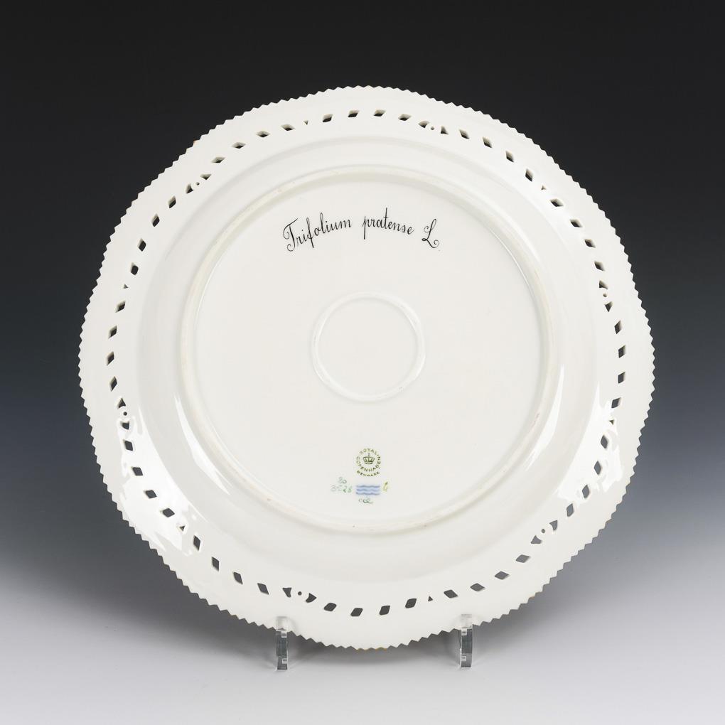 Plate with openwork flag and serrated rim. In the mirror the depiction of a meadow clover plant, inscribed in Latin on the underside. Under the rim a small burst air bubble (due to manufacturing).
