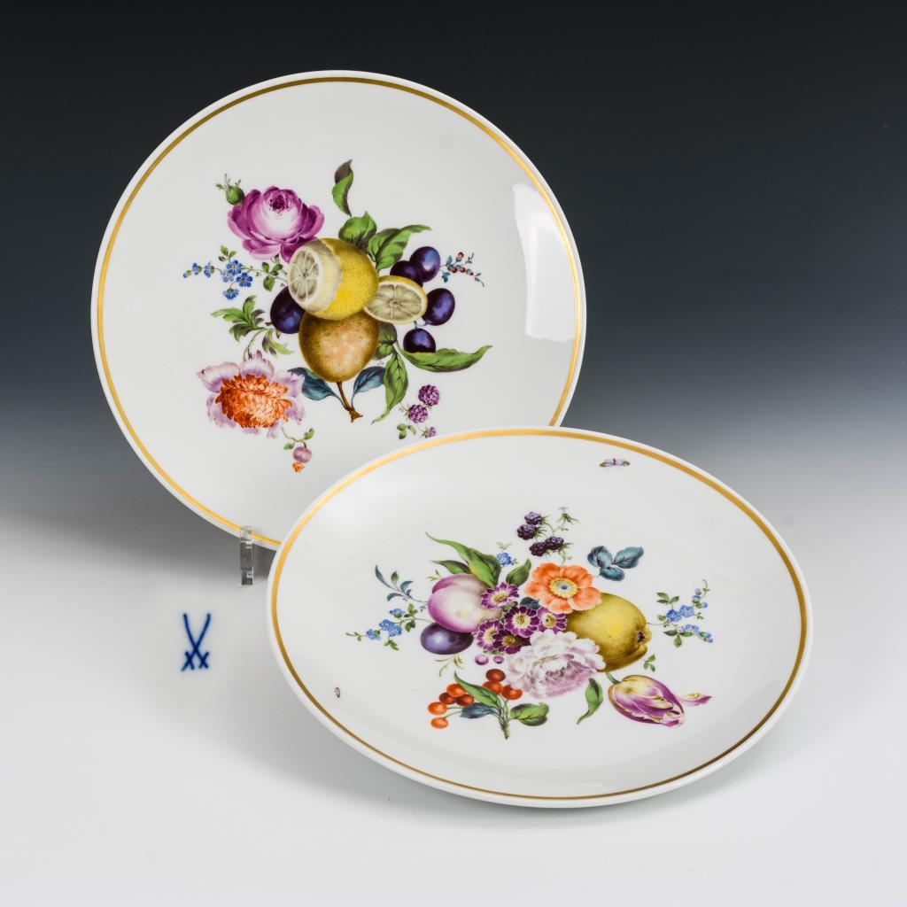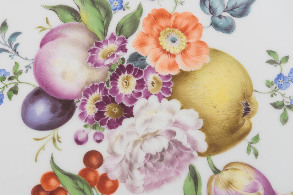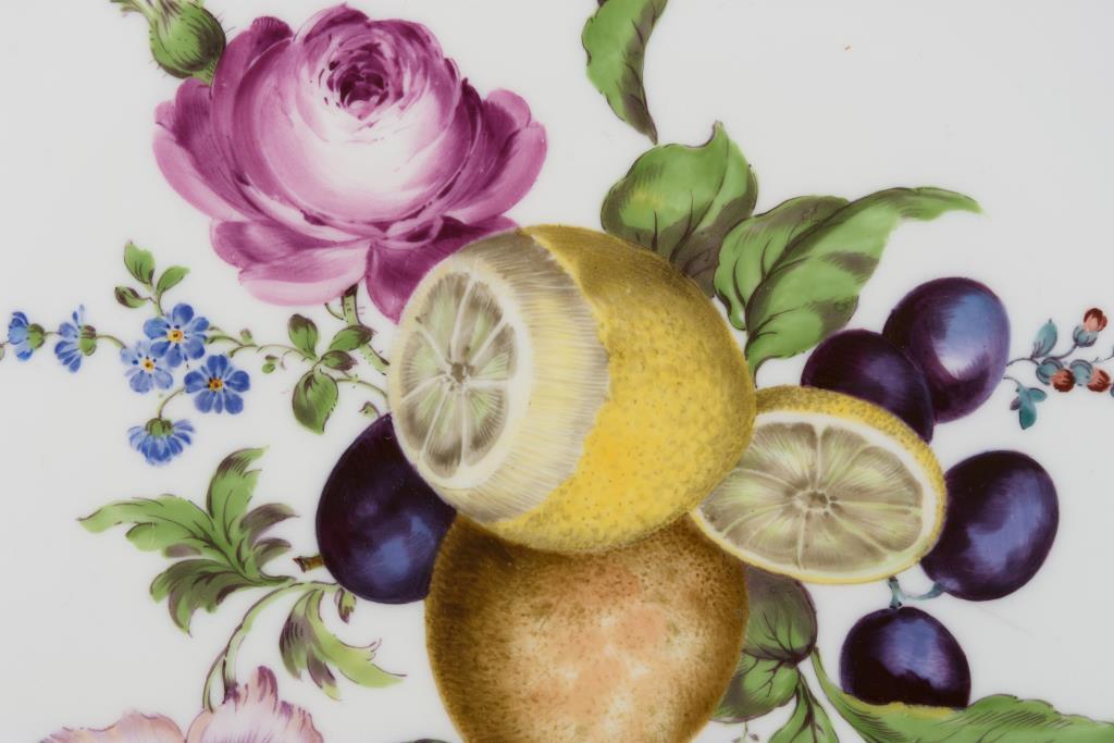 Teller mit fein gemaltem Frucht- und Blumenbukett im Spiegel.