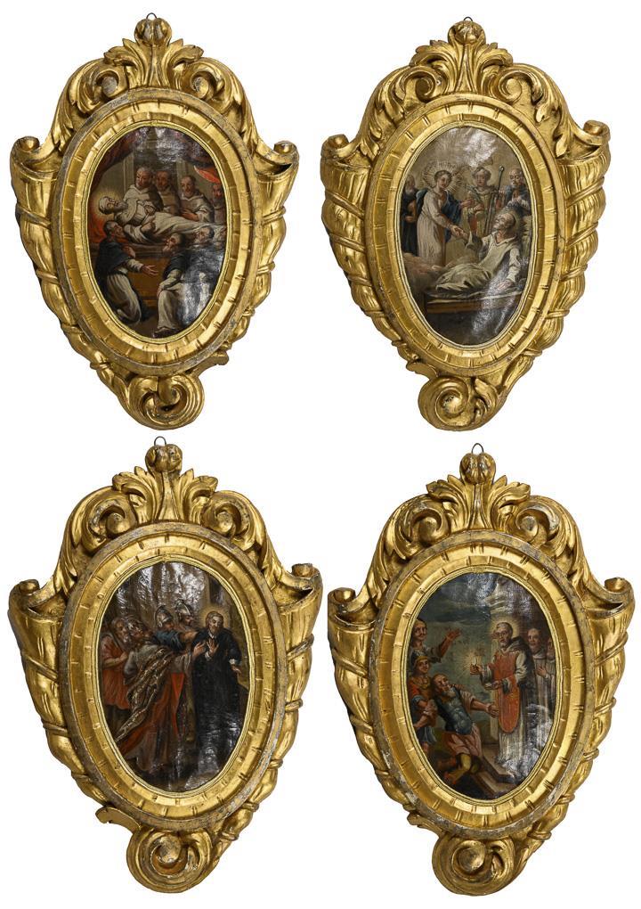 Pictured are the miraculous healing of Emaus, the raising of Lazarus, the arrest of Jesus and a scene with astonished people and a saint. Traces of age.