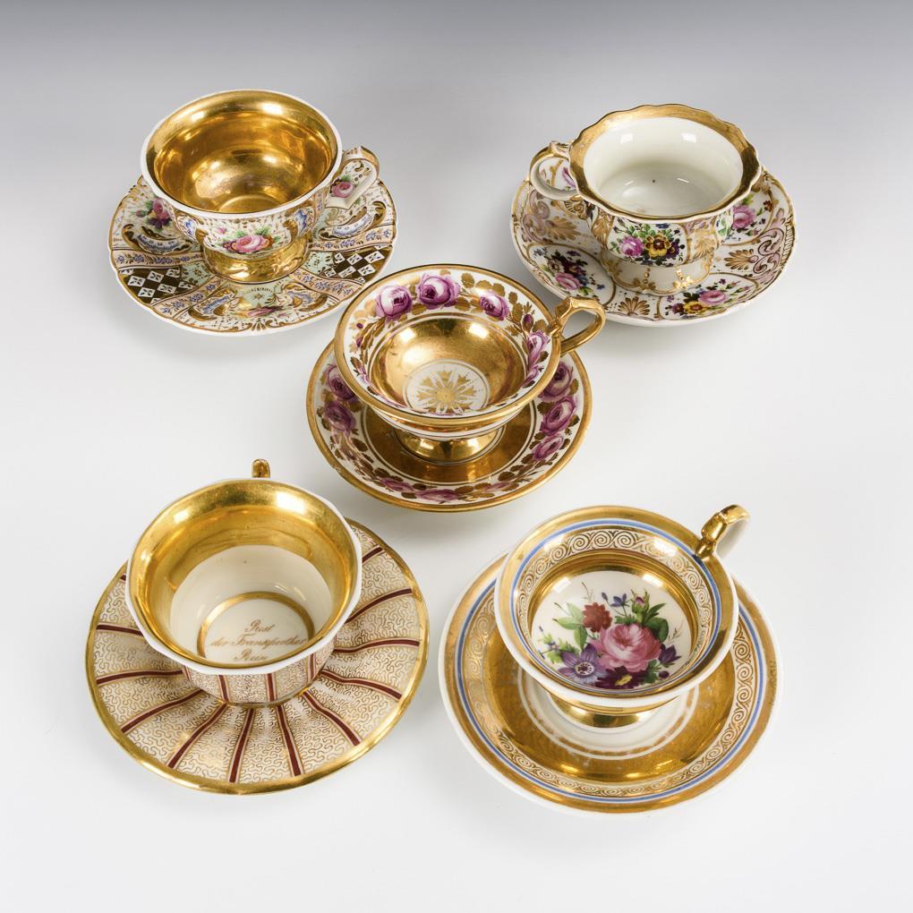 Polychrome painted, gold decorated. H cups 6,5-8,5 cm, Ø original saucers 13,5-14,5 cm.
