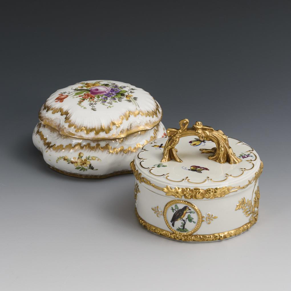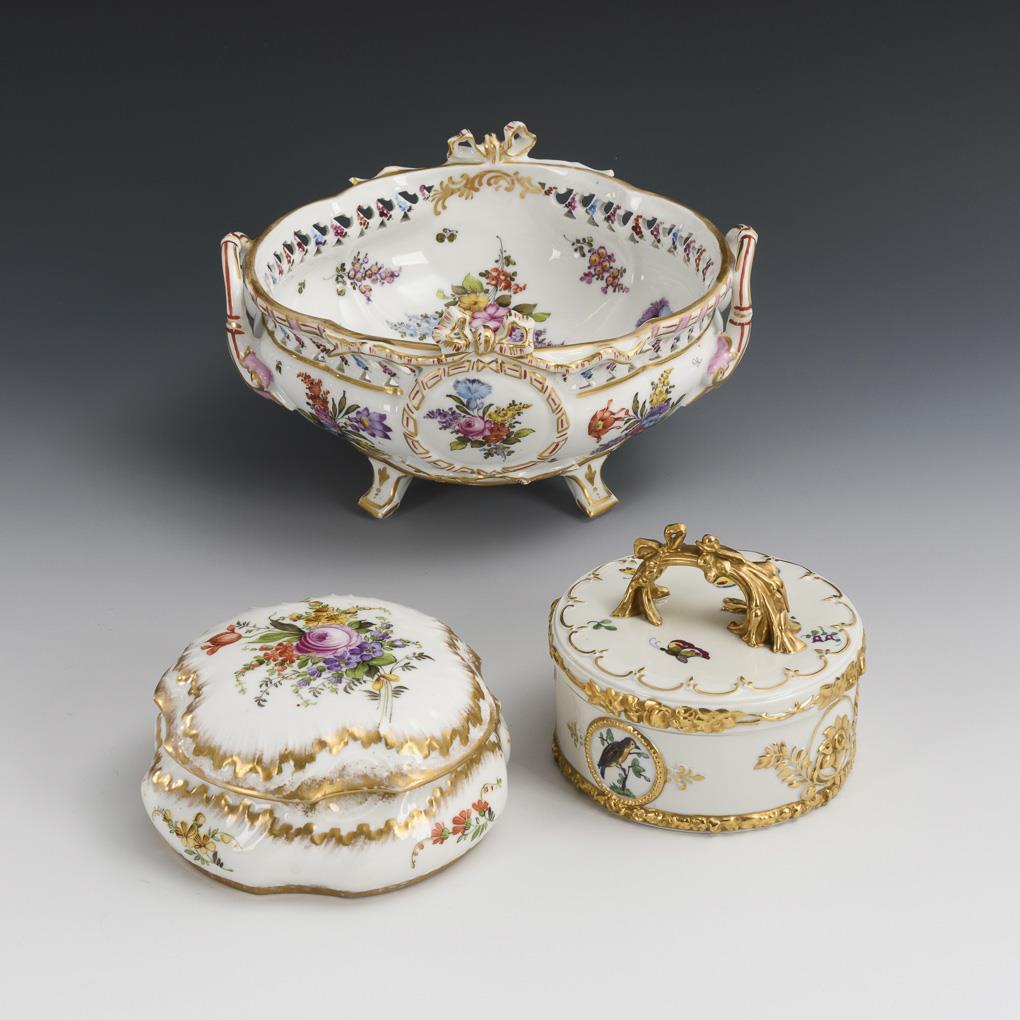 1x Paris, Bourdois & Bloch: four-piece bowl with four feet, two handles and rich floral painting (Ø 22 cm). / 1x Aelteste Volkstedter: rounded box with gold decorated floral relief and bird painting (Ø 10,5 cm). / 1x Four-pass box with floral painting (Ø 12.5 cm). Dish with edge bump, 1 box with hairline crack on the lid inner rim.