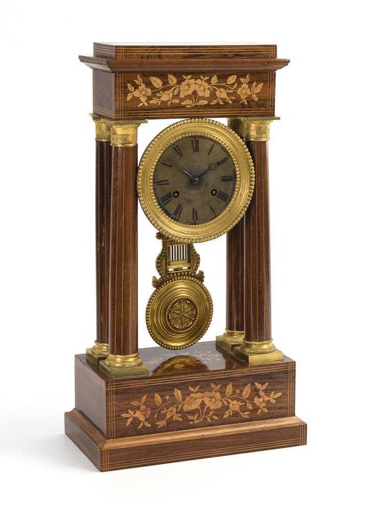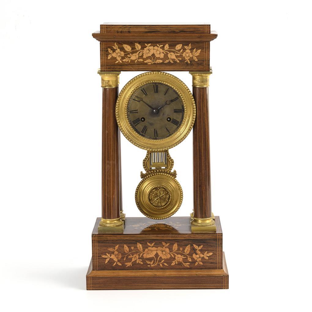 Late Biedermeier portal clock with floral inlays.