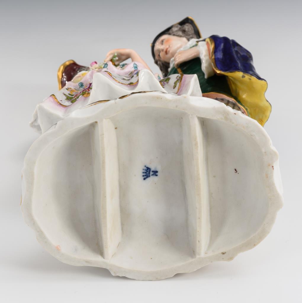 Auf einem Rocaillesockel stehendes Rokokopaar. Blüten in der Hand der Dame geklebt, Blüten bestoßen, partiell minimaler Goldabrieb.