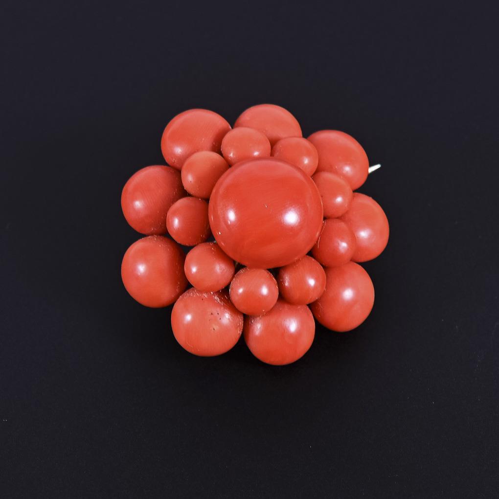 Flower brooch with 3-ebn mounted coral lenses. Metal hook clasp, 2 rigid hook eyes.