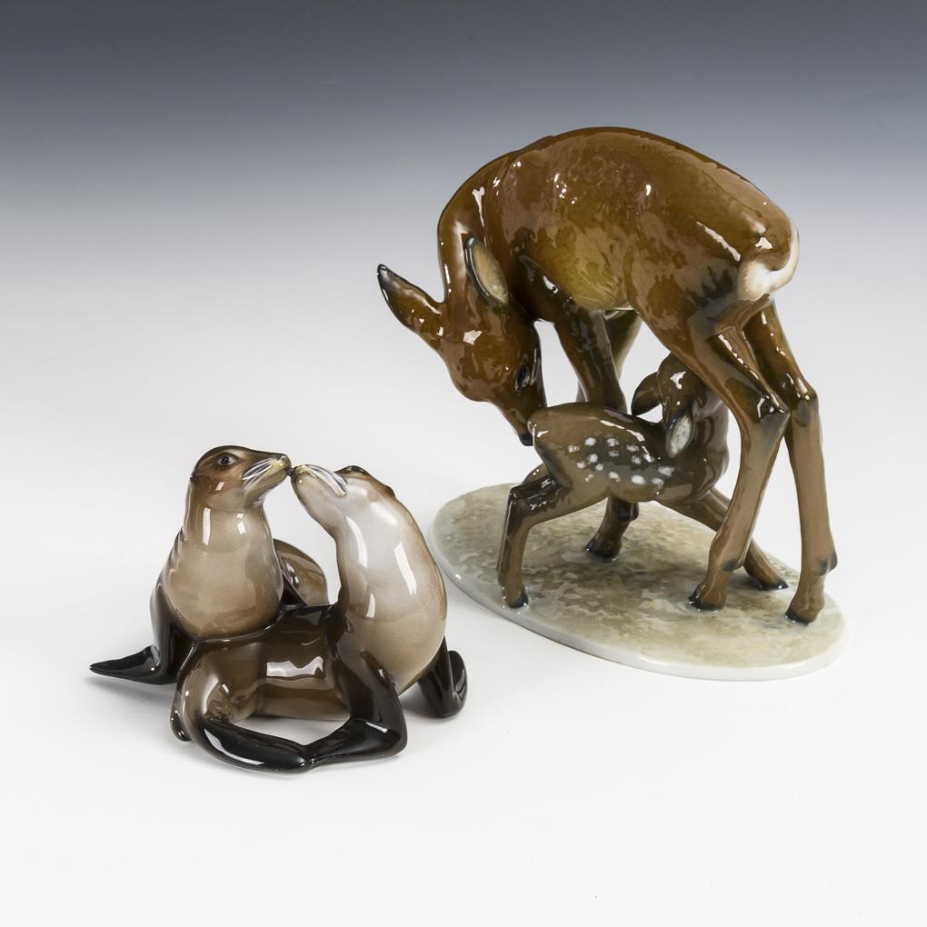 Doe with fawn, on oval base. Design Rudolf Rempel (1892-1970). Model no. 1638. h 15,5 cm. / Playing seals. Design Karl Himmelstoss (1872-1967). Model no. 1311. h 8,5 cm. Hairline crack at base and front legs of fawn.