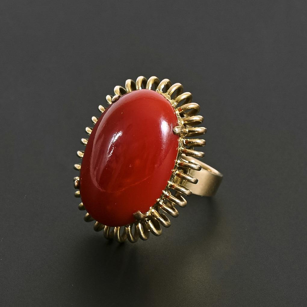 Yellow gold 585 stamped. Coral 2.5 x 1.6 x 1 cm. Ring size 55. 13.6 g.