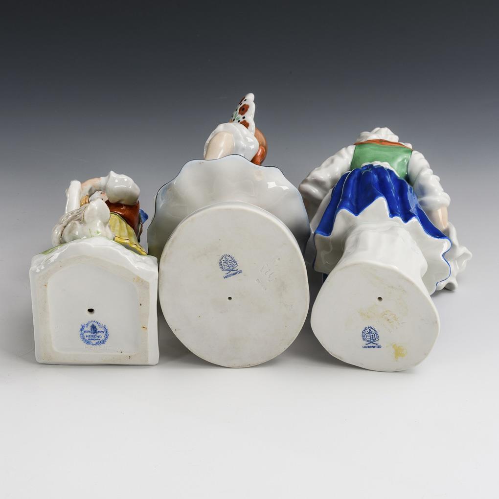 1x fish seller, model no. 5703 (h 24,5 cm). / 1x dancing girl, model no. 5423 (h 20 cm). / 1x peasant girl with goose, model no. 5545 (h 17 cm). 1 finger of the goose girl bumped.