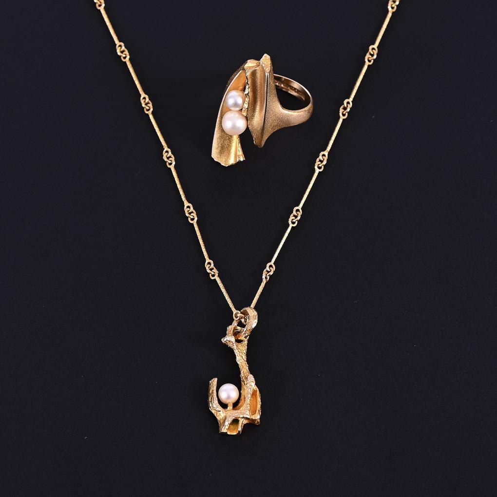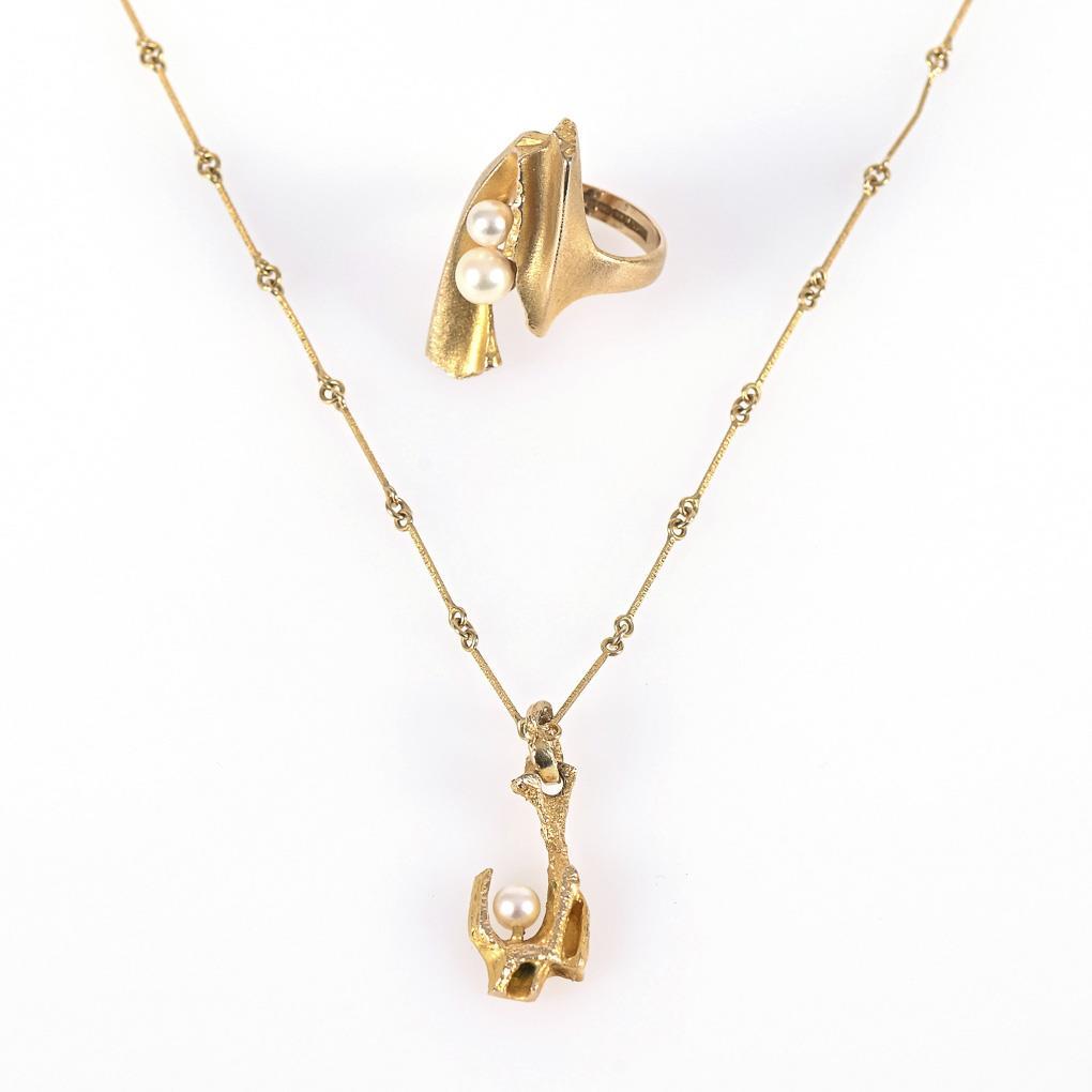 Yellow gold 585 stamped. Hallmark: 1x LAPPONIA, Y 7 (1976). 1x LAPPONIA, R 8 (1994). Pendant 2,5 x 1 cm. Chain L 46,5 cm. Ring size 53. 6,4/6,9 g.