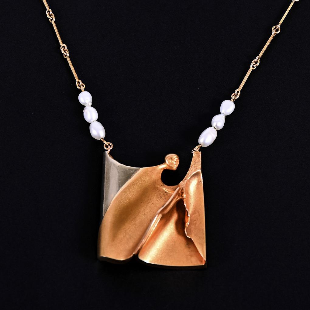 Heavily textured pendant and small cultured pearls, between bar link chain on hook clasp with safety eye.