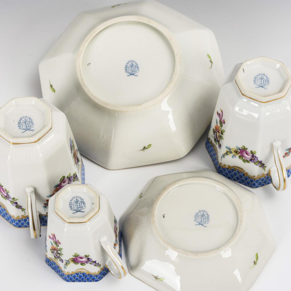 Polychrome painted, gold decorated. H cups 6 and 8,5 cm, Ø saucers 11 and 14,5 cm.