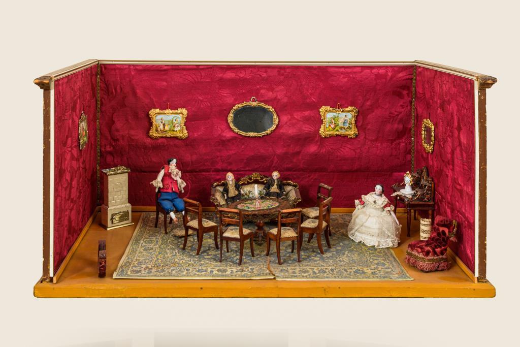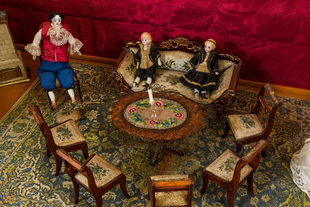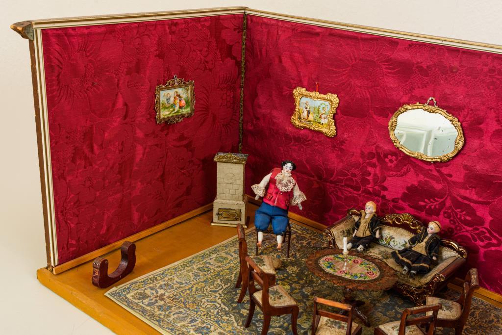 1-Raum-Puppenstube mit roter Wandbespannung und braun lackiertem Boden. Eingerichtet mit: Sofa, 6 Stühlen mit bedrucken Seidenbezugsstoffen und ovalem Tisch sowie passendem Schreibtisch aus Holz mit vergoldeten Metallapplikationen. Dazu 1 Blechofen, 2 Spiegel und 3 Bilder Erhardt & Söhne (4x Goldblech, 1x Zinn) sowie 1 großer defekter Teppich und 4 alte Püppchen (2 Füße defekt). Bespielt, mit kleinen Defekten und Reparaturen.