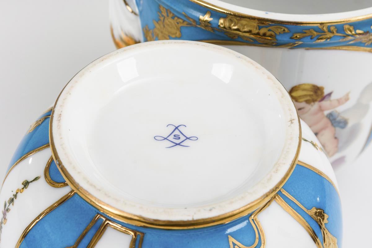 Cylindrical form with indented stand and two scrolled handles. Turquoise blue background, on both sides a large gold-framed cartouche depicting pairs of putti on clouds.