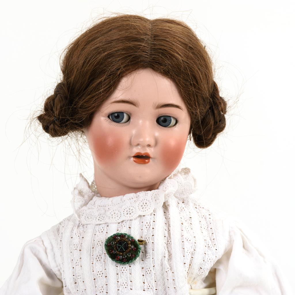 Kurbelkopf, blaue Schlaf-/Schelmenaugen, offener Mund, Zähnchen, braune Echthaarperücke. 13-teiliger Gliederkörper. Weiße Bluse, Leinenrock mit grünem Samtband, schwarze Schuhe. Kopf durchleuchtet: ohne Defekte. Körper überfasst.