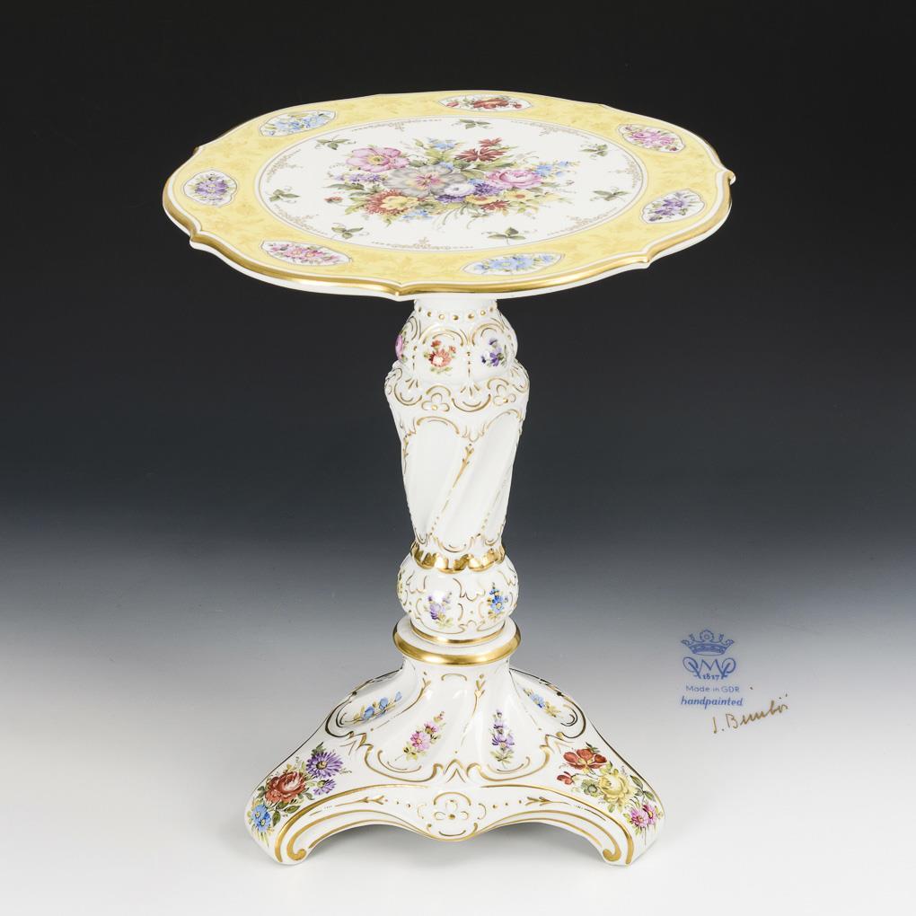 Seven-piece table top on multiple jointed shaft, three-sided foot. With rich floral painting and lemon yellow fond band on the table top.