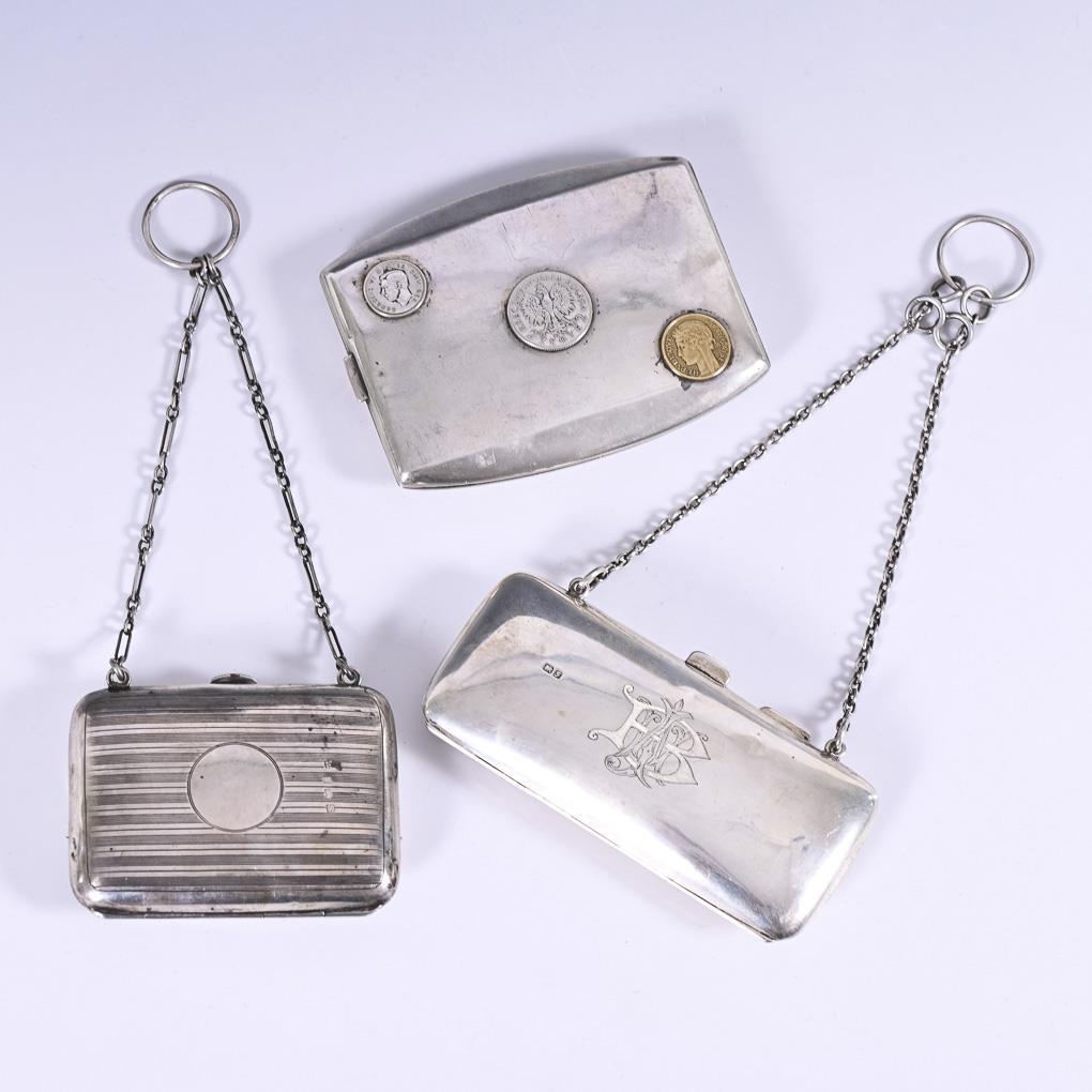 Coin case (Warsaw, from 1920). Purse with groove engraving (Birmingham, 1915). Pouch with monogram engraving ABW (Chester, 1906). Heavy traces of use, dents.