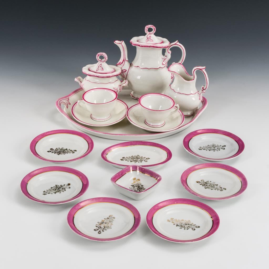 16 Teile ungemarktes Porzellan mit Purpurrand. Dejeuner auf Tablett. Dazu Teile eines Speiseservice mit Golddekor. Teils kleine Bestoßungen.