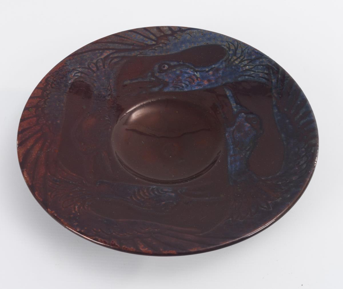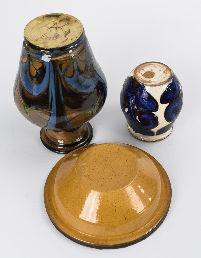 2 Art Nouveau vases, 1 bowl and 1 wall plate with slip painting. Herman August KÄHLER (1846-1917 Naestved).