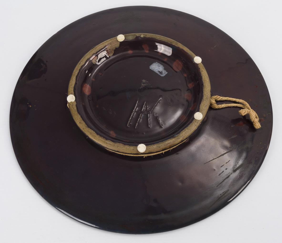 2 baluster vases (h 12 and 22,5 cm) and 1 brown bowl (Ø 20 cm) with stylized floral decoration, 1 purple plate with wide rim (Ø 28 cm). Bowl and vases at the rim partially slightly bumped, small vase with mouth hairline crack.