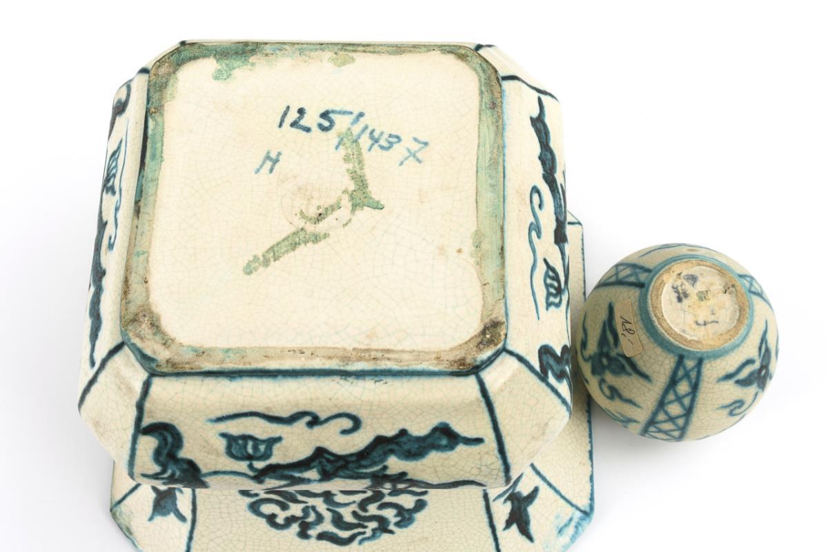 Wide funnel vase (h 15,8 cm), small baluster vase (h 7,5 cm) and cube box with stepped lid (h 15,3 cm) with light crackle glaze and turquoise blue stylized decoration. Hexagonal plate with abstract colored painting (L 32,5 cm). Signs of age and use, partially small defects, plate with crack throughout.