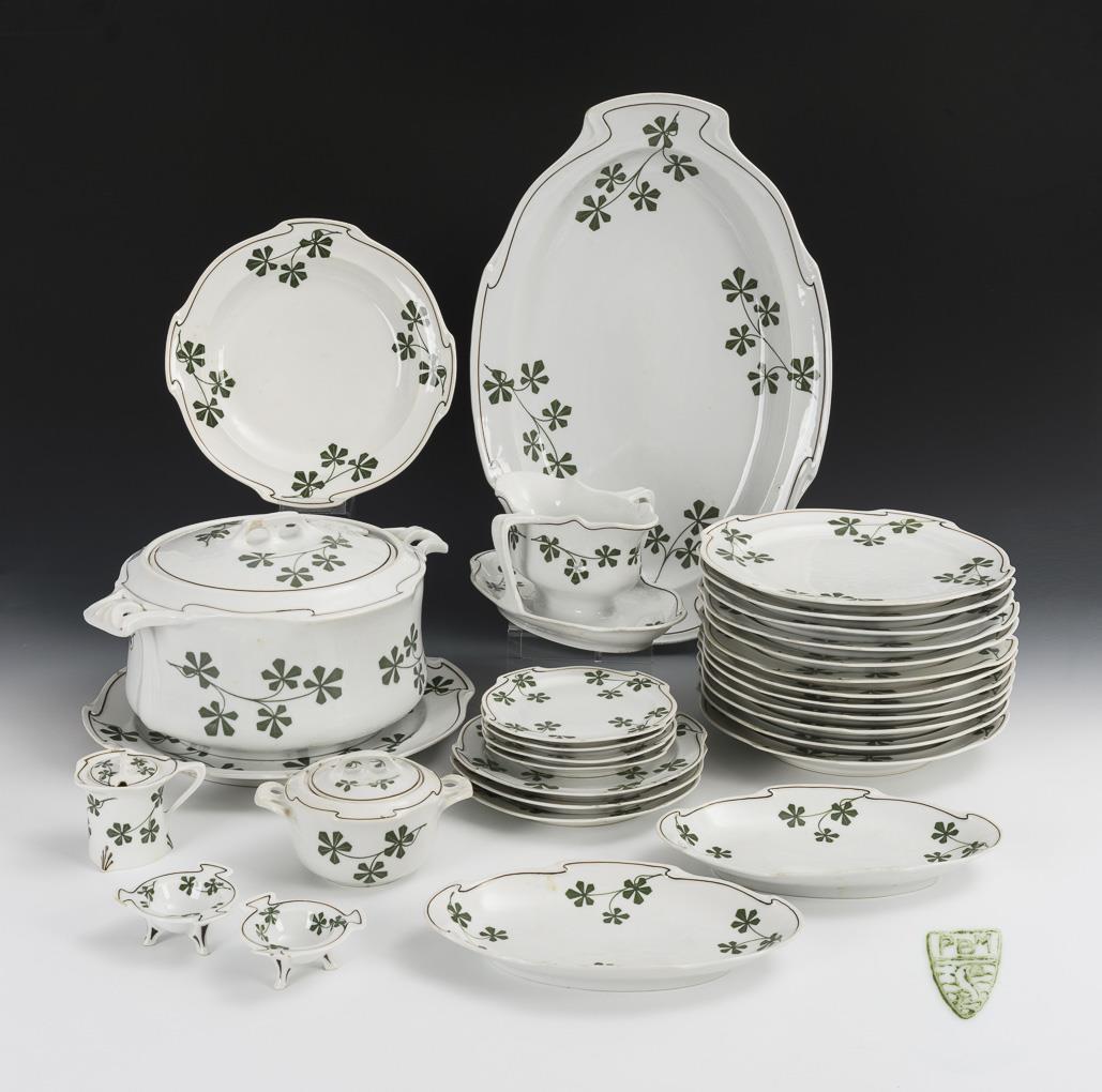 7 dinner plates (Ø 26.5 cm), 6 soup plates, 3 salad plates, 4 dessert plates, 1 oval plate (L 51.5 cm), 2 oval bowls (L 25.5 cm), 1 sauce boat, 1 mustard pot (without spoon), 1 sugar bowl, 2 salters and 1 tureen (H 18.5 cm) with 1 saucer. Traces of use, partly bumped, 1 small oval plate, 1 lid and 1 soup plate with hairline crack, tureen bottom with hairline crack, mustard pot yellowed inside, 1 dinner plate restored and cracked.