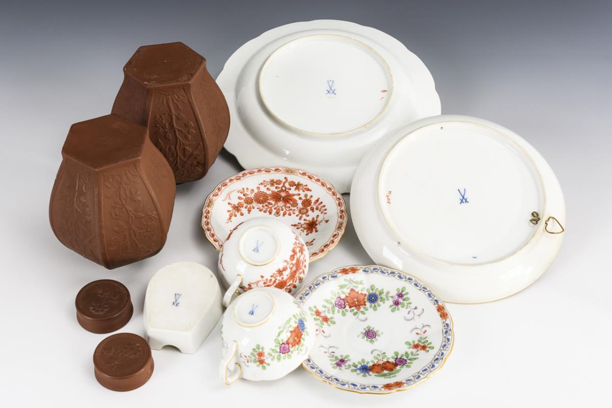 2 tea caddies Böttger stoneware with floral and bird relief (h 12 cm), 1 breakfast plate "Altozier" (Ø 21 cm), 2 demitasse cups "New Cut" with 2 saucers, 1 horseshoe-shaped ashtray and 1 plate with dragon and stork (Ø 17.5 cm). 1 tea caddy lid glued.