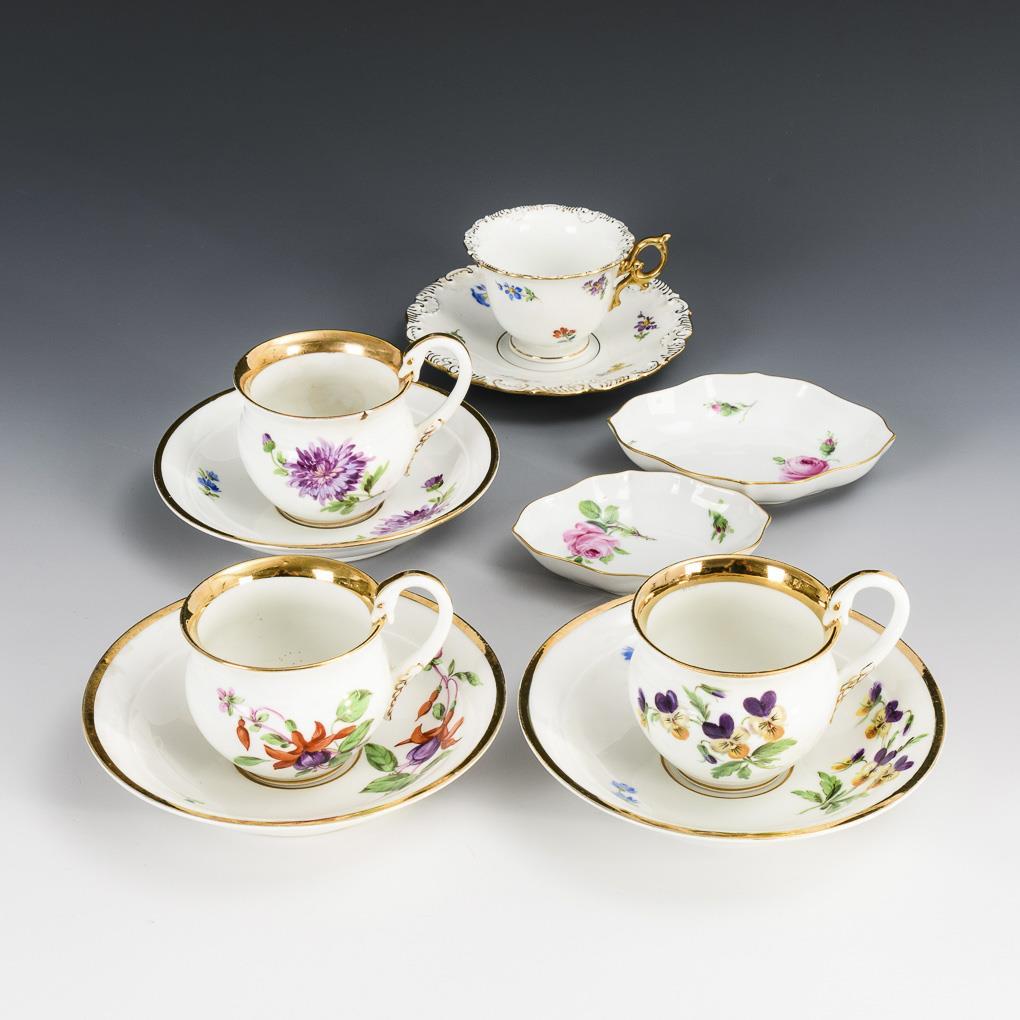 4 Tassen mit Untertassen und 2 Schälchen mit Blumenmalerei. Meissen.