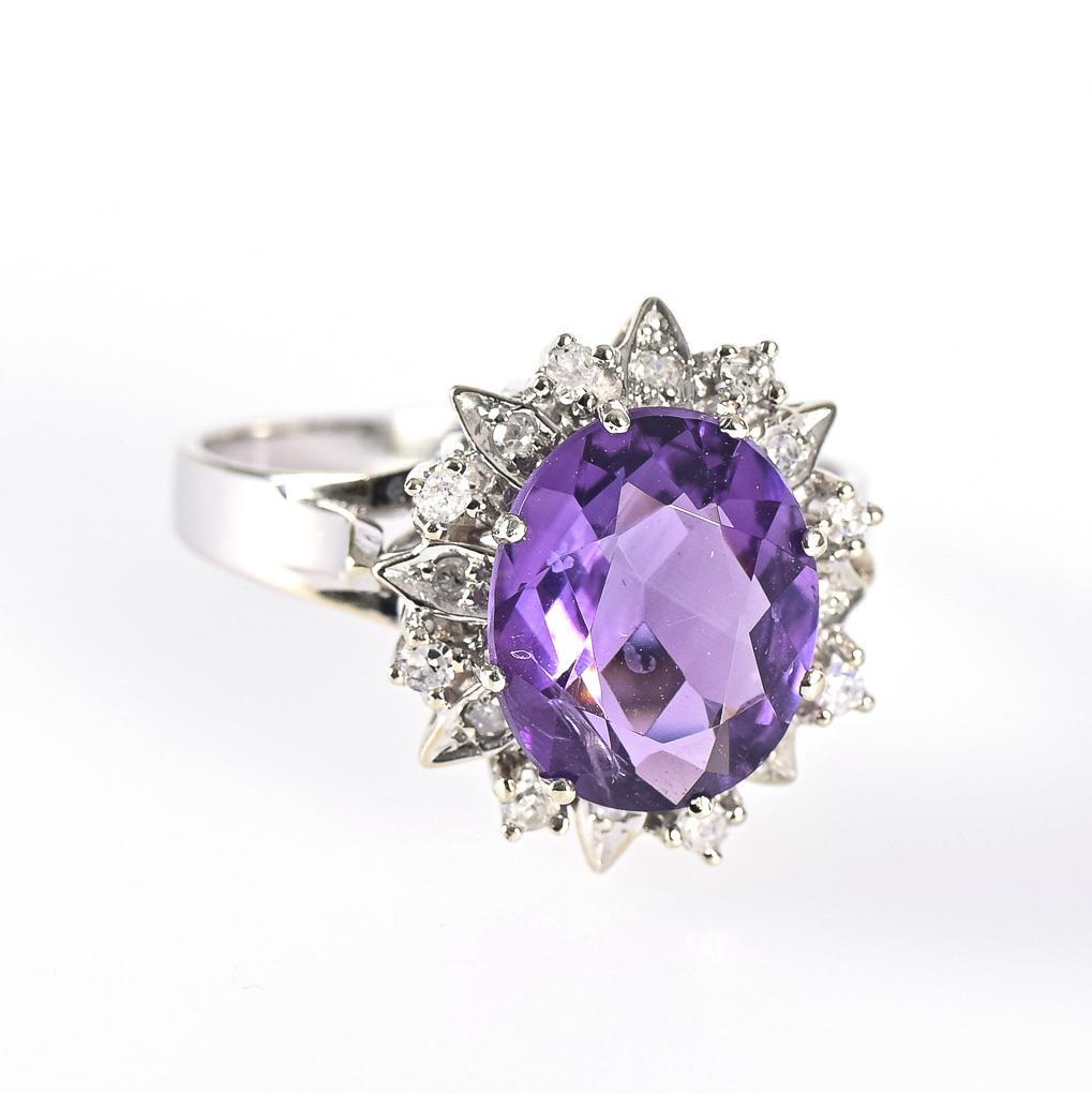 Raised set amethyst surrounded by 16 diamonds between center rail.