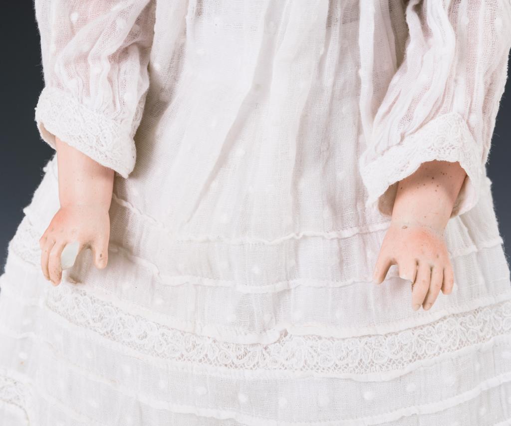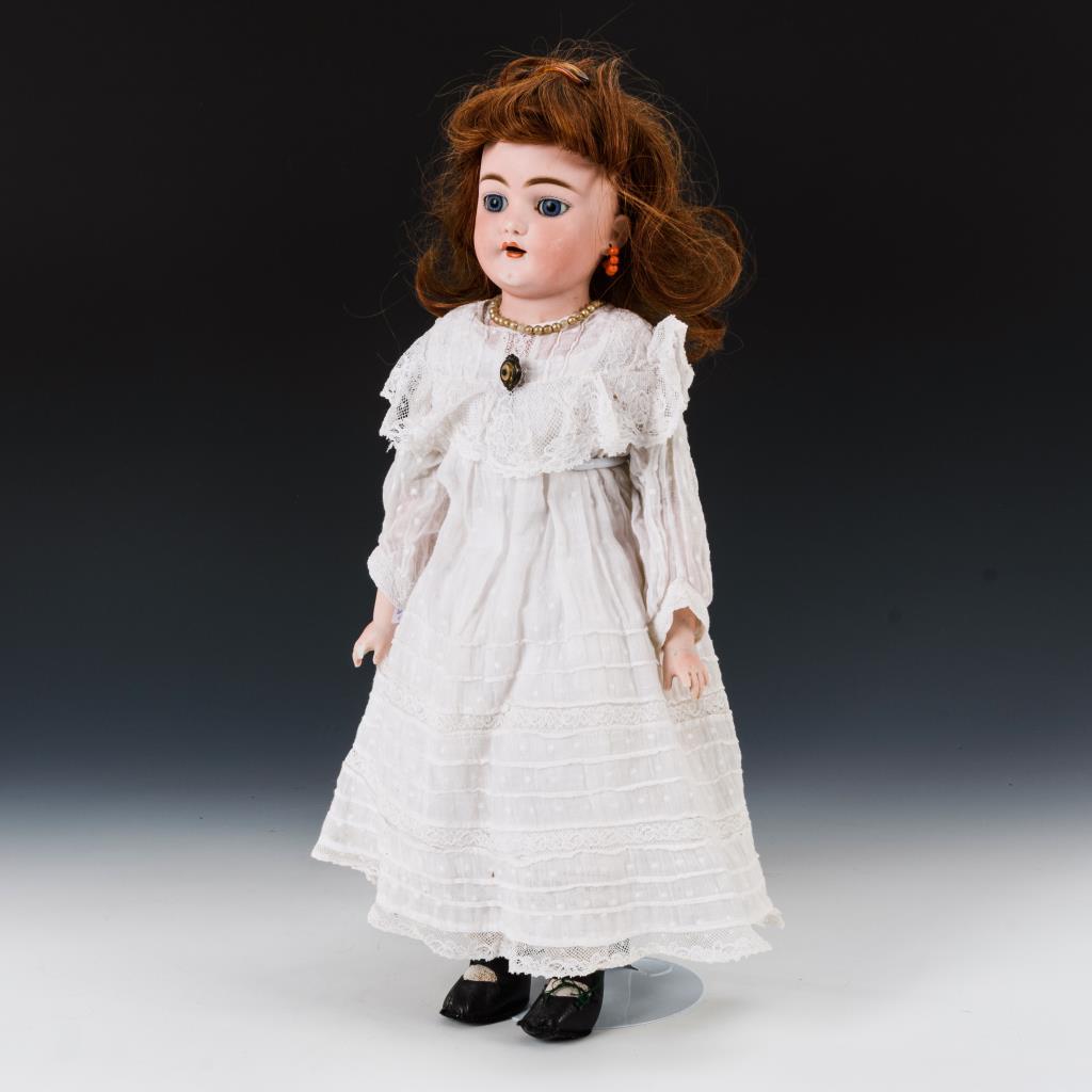 Brustkopf, blaue Schlafaugen, offener Mund ohne Zähnchen, Ohrringe, rotbraune Echthaarperücke. Lederkörper mit Biskuitunterarmen. Weißes Kleid, Perlenkette, schwarze Schuhe. Mehrere Finger fehlend, Perücke fest mit Gips verklebt.