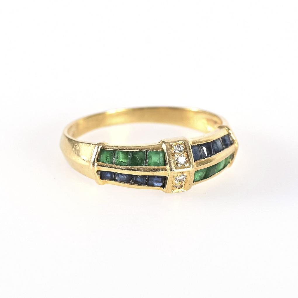 8 emerald and sapphire carres and 2 small inset diamonds in center rail.