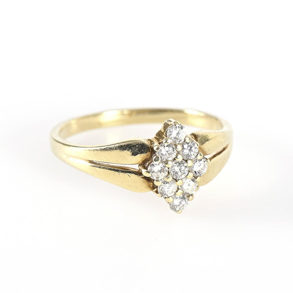 Yellow gold 585 stamped. Ring size 56. diamonds total 0.35 ct. 2.9 g.
