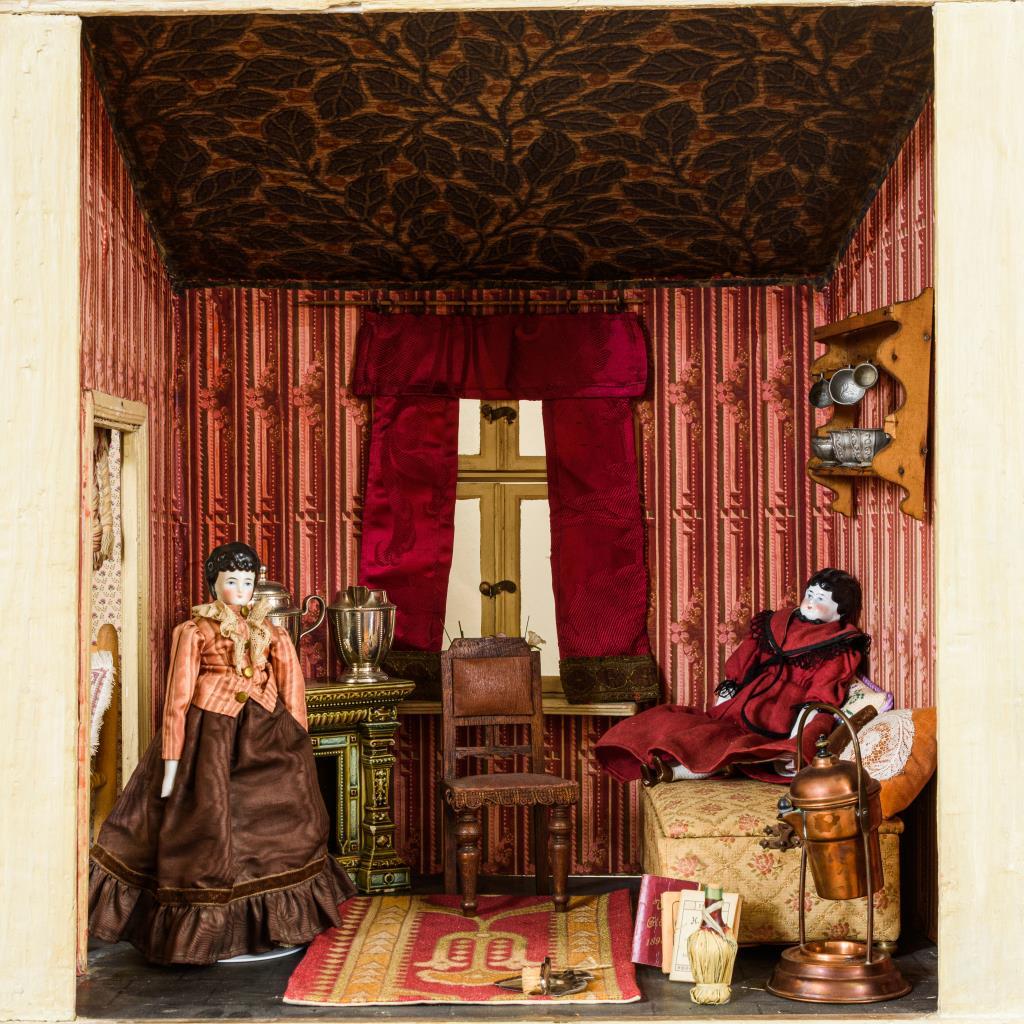 4-Raum-Gehäuse mit 5 verglasten Fenstern. Schlafzimmer mit Metallbett und Stuhl. Kleine Stube mit Chaiselongue und Keramik-Kamin. Esszimmer mit großem Büfettschrank und Zinngeschirr. Küche mit Regal, Jugendstil-Emailgeschirr, Blech. Dazu 7 Puppen mit Defekten und Ergänzungen, darunter eine Blechkopfpuppe.