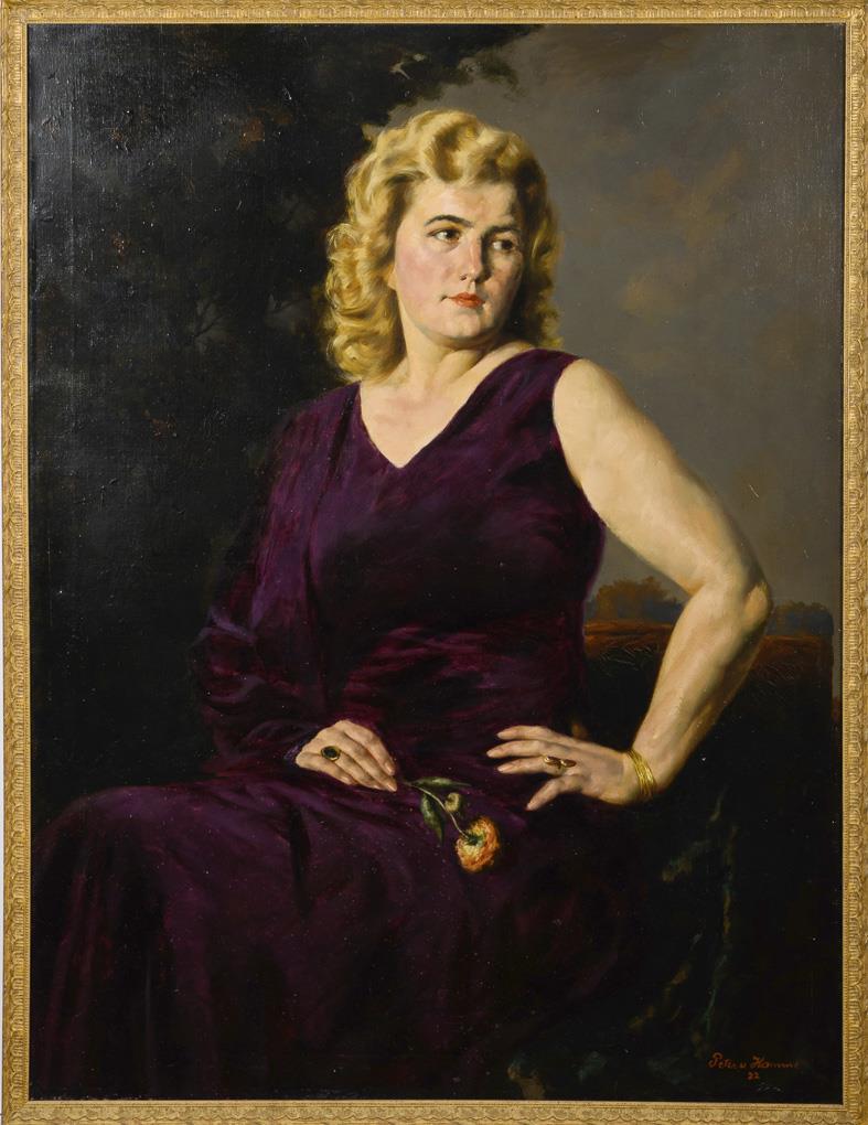 Portrait of a woman in purple dress with rose in front of a landscape. Supplement 27.10.22: A defect. Retouched.